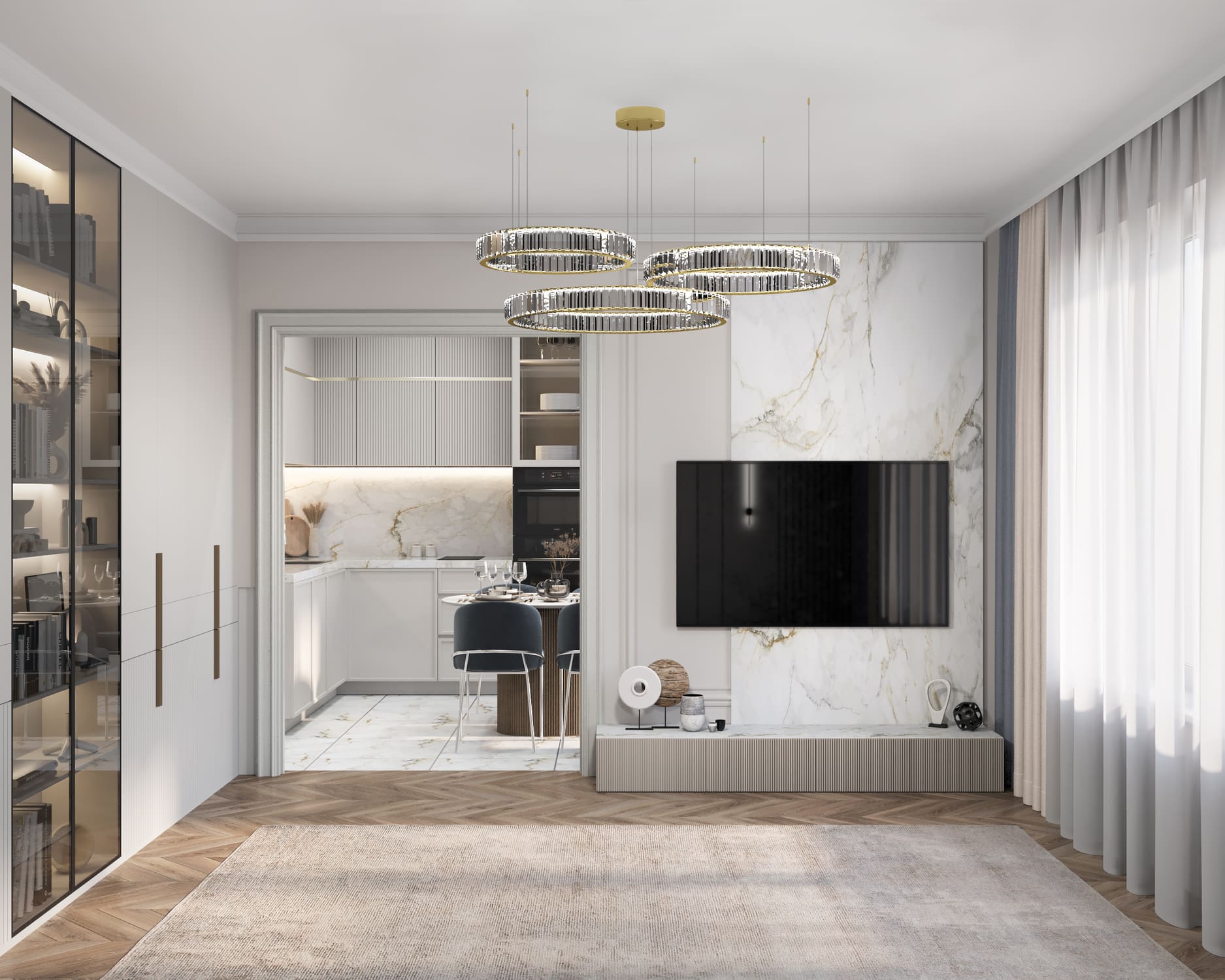 Напротив дивана — ТВ-зона с облицовкой под мрамор и низкой консолью. Она выглядит элегантно и при этом остаётся функциональной. Большие окна, оформленные многослойными шторами, пропускают максимум света днём и создают мягкое, уютное сияние вечером.