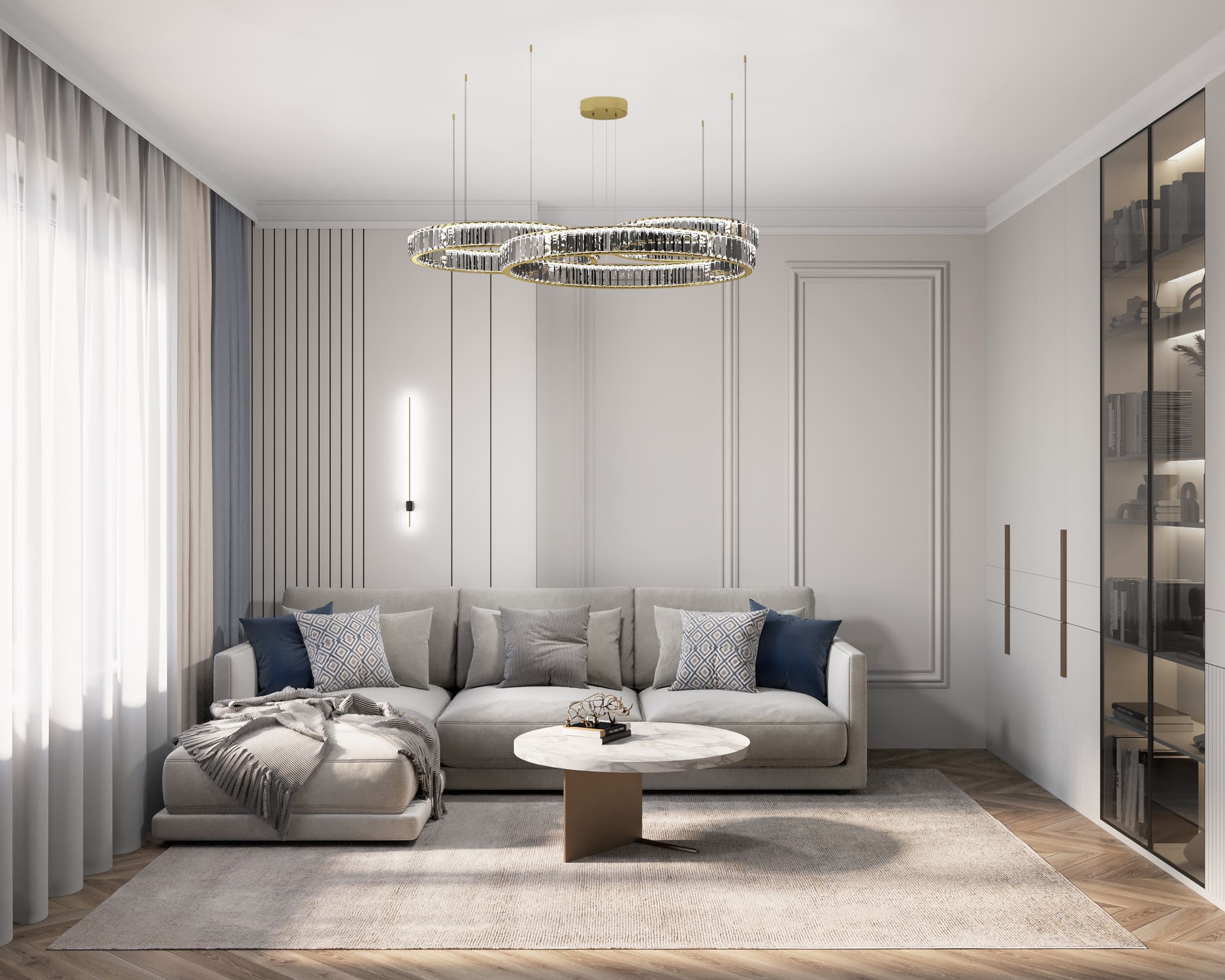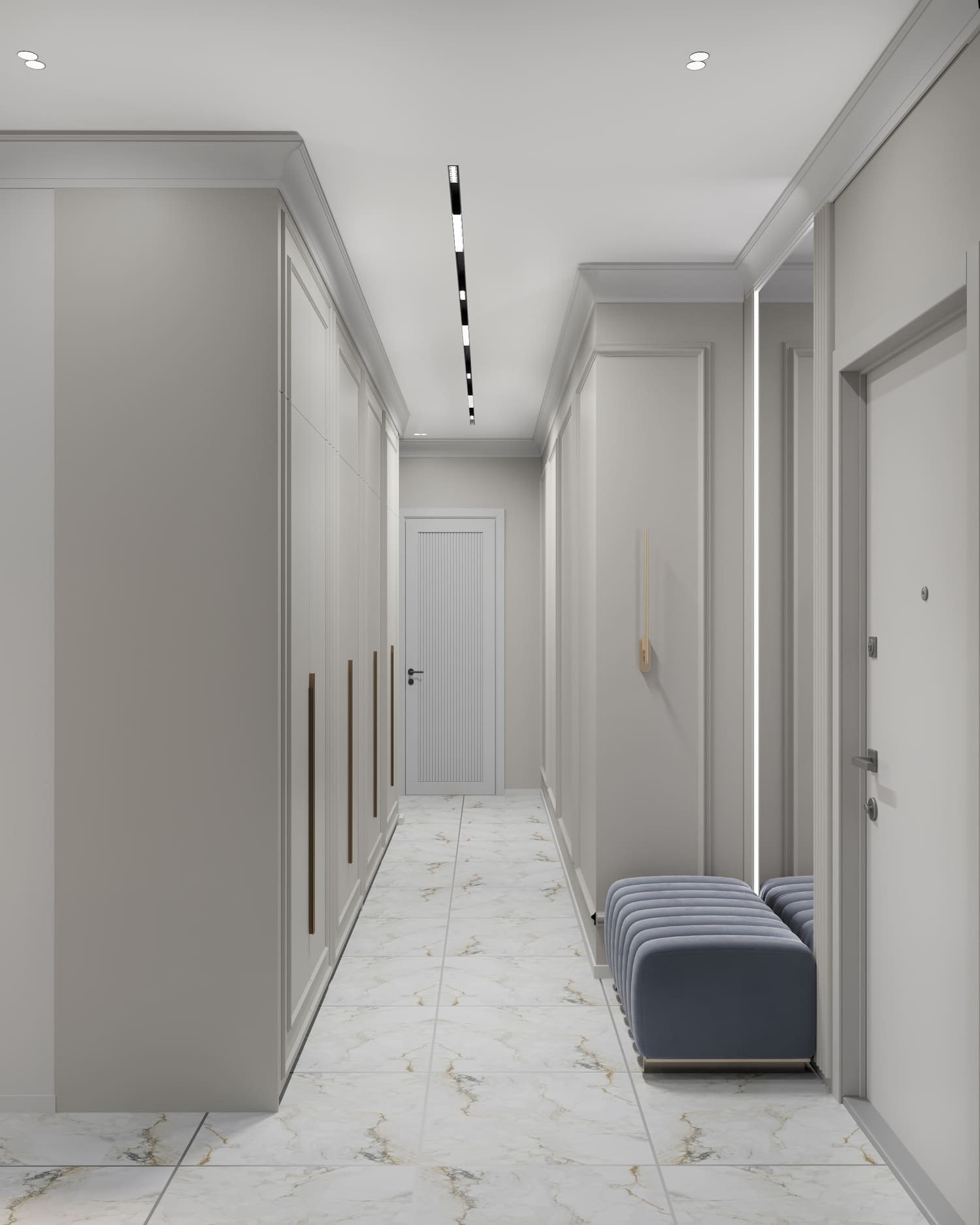 Эта квартира создана для супружеской пары, которая ценит спокойствие и гармонию в интерьере. За основу выбран стиль неоклассика — сдержанный, утончённый, с мягкими акцентами, подчеркивающими элегантность пространства. Цветовая гамма построена на молочных оттенках, дополненных холодным голубым — сочетание, которое наполняет интерьер ощущением свежести и лёгкости.