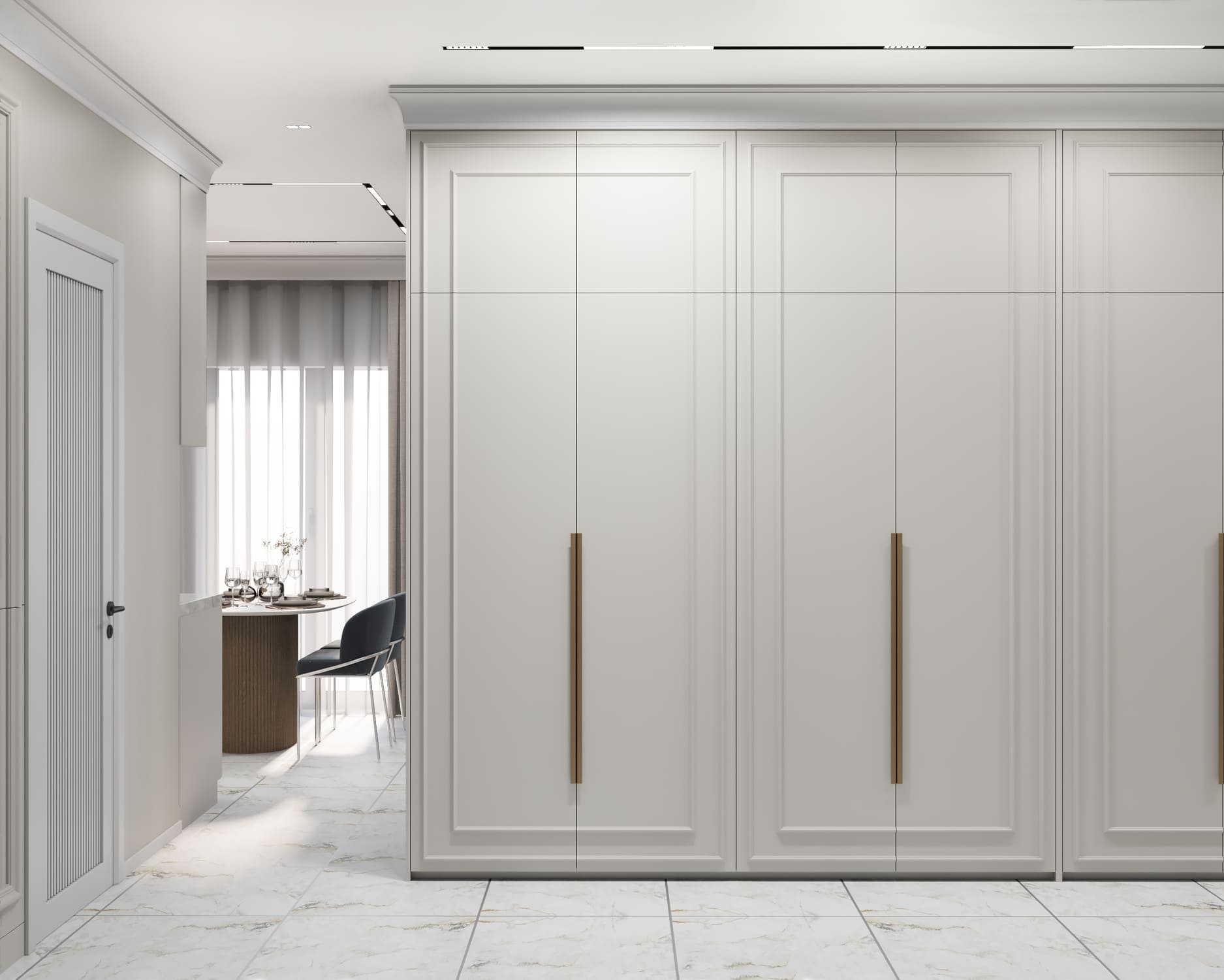 Прихожая оформлена в светлых молочных тонах, которые визуально расширяют пространство и создают ощущение чистоты. Зеркальные вставки и аккуратные молдинги на стенах подчеркивают неоклассический характер интерьера.