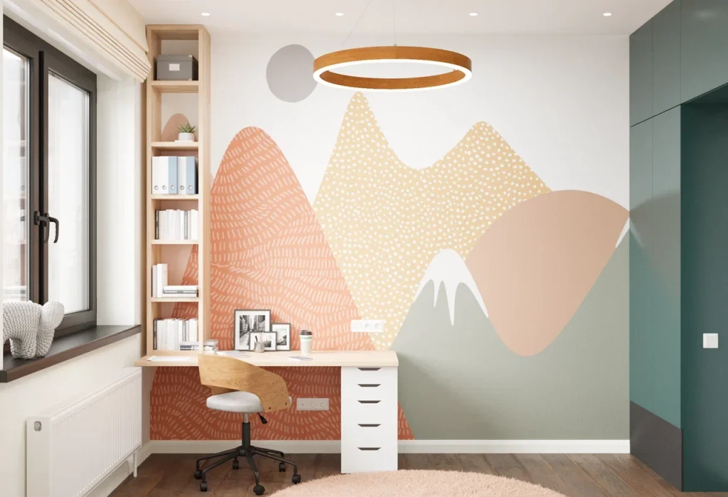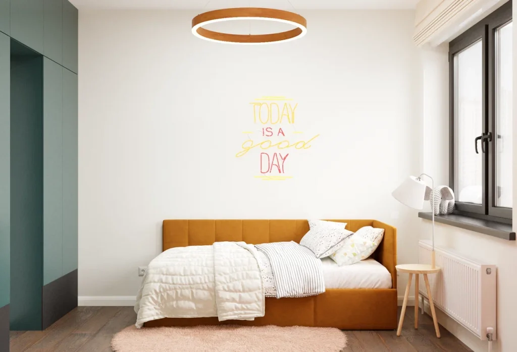 Окна деткой комнаты выходят на общественный бассейн и за счет яркости интерьера решили отвлечь внимание от этого вида. Комната выполнена в интересном и современном сочетании сложных оттенков: мятный, горчичный и терракотовый на бежевом фоне. Основную зону хранения решено было разместить вдоль стены с дверью - это встроенная мебель, выполненная на заказ. За счет такого расположения, мебель абсолютно не загромождает пространство, но является очень функциональной. Также в комнате присутствует рабочее место и кровать.