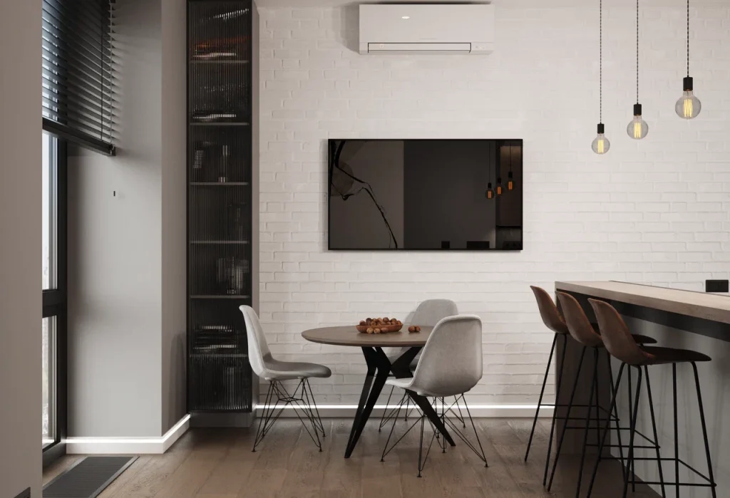 Лаконичная совмещенная кухня с гостиной зоной - одна из современных тенденций, реализованная в данной квартире. Здесь расположены основные классические зоны: кухня буквой П с барной стойкой, диван и TV напротив, круглый обеденный стол. Стена с телевизором с текстурой кирпича и кухонный фартук из плитки под бетон - одна из характерных черт стиля лофт, который присутствует в интерьере. А светильник из черной трубы с винтажными лампочками дополняет их. Кухня с двухуровневыми подвесными шкафчиками в потолок смотрится очень монолитно и современно, не загромождая пространство, за счет этого помещение кажется более просторным. Подсветка шкафчиков подчеркивает геометрию кухни и несет свою основную полезную функцию. Бирюзовый диван - единственное яркое цветовое пятно, которое добавляет нотку свежести в интерьер.
