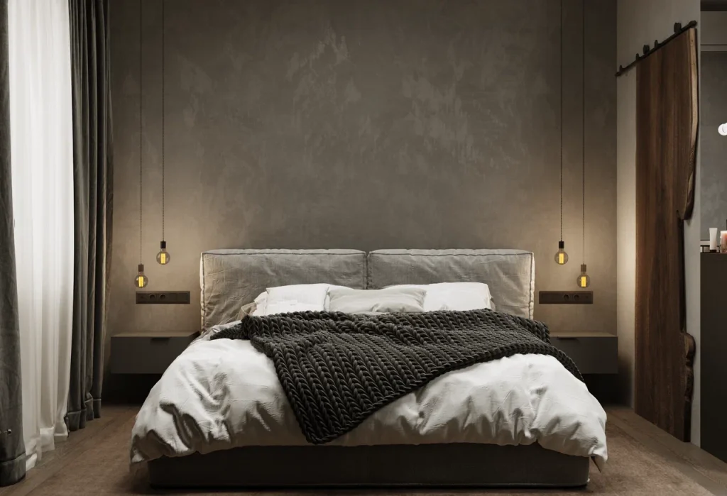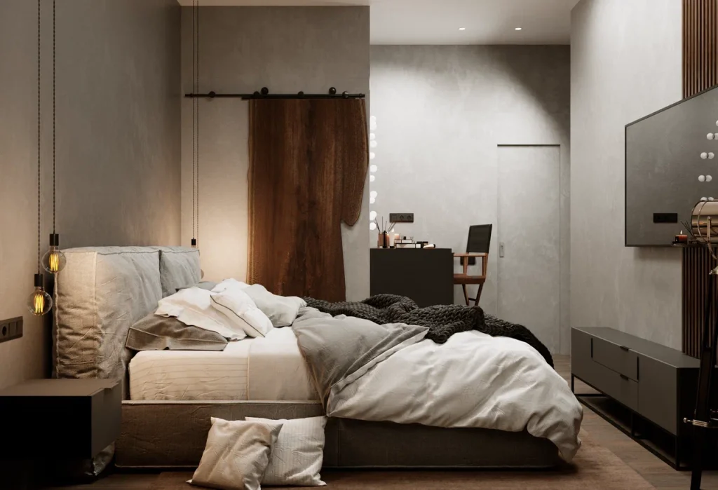 Спальня включает в себя основные зоны - это спальная с большой мягкой кроватью в стиле лофт и прикроватными тумбами, зону TV и вспомогательную зону - туалетный столик с зеркалом. На большом зеркале лампочки расположены по кругу, как в гримерных - это смотрится необычно и является интересным решением. Также из спальни есть вход в гардеробную комнату. Дверь в гардеробную на амбарном раздвижном механизме играет роль арт-объекта помещения, так как полотно двери выполнено из цельного слэба дерева. Отделка стен спальни темная и с текстурой бетона, что в совокупности с теплой подсветкой создает камерную обстановку.