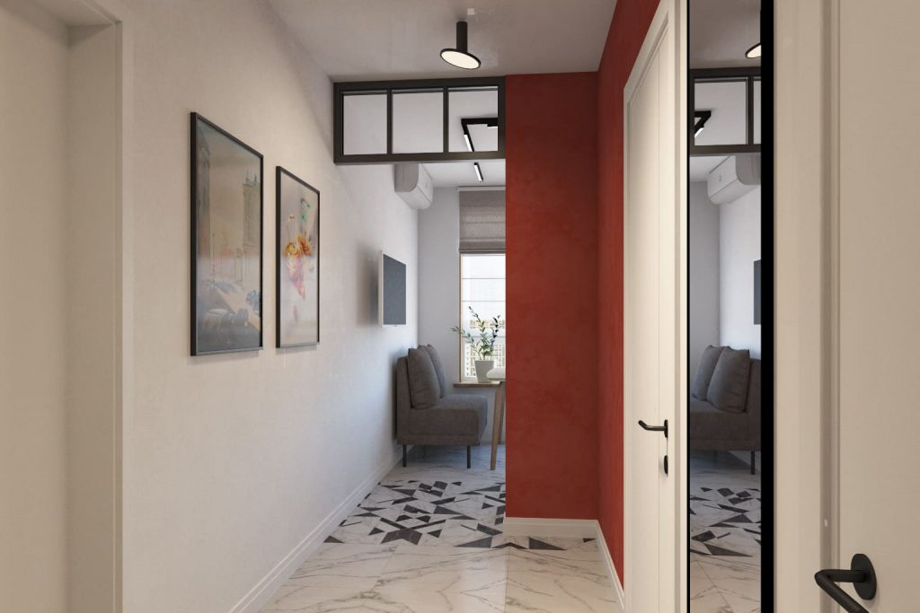 Использование модульных систем хранения позволяет адаптировать пространство под конкретные нужды хозяина. Панель с молдингами и текстурная штукатурка добавляют эстетическую ценность, подчеркивая изысканный вкус заказчика. Эргономически правильное расположение шкафа и пуфа у входа делает процесс снятия обуви удобным и эффективным. Широкий проход обеспечивает комфортное передвижение, что крайне важно для динамичного образа жизни молодого заказчика. Точечные светильники с правильной температурой света создают мягкое и равномерное освещение, делая прихожую светлой и приветливой.