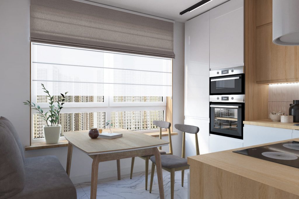 Интегрированные светодиодные подсветки под навесными шкафами обеспечивают дополнительное освещение рабочих зон, делая приготовление пищи удобным и безопасным. Рабочая поверхность кухни, установленная на эргономической высоте, поддерживает здоровье спины и облегчает кулинарные процессы. Барные стулья у кухонного стола создают неформальную атмосферу для быстрых перекусов или утреннего кофе, поддерживая тренд на объединение функциональных и общественных пространств.