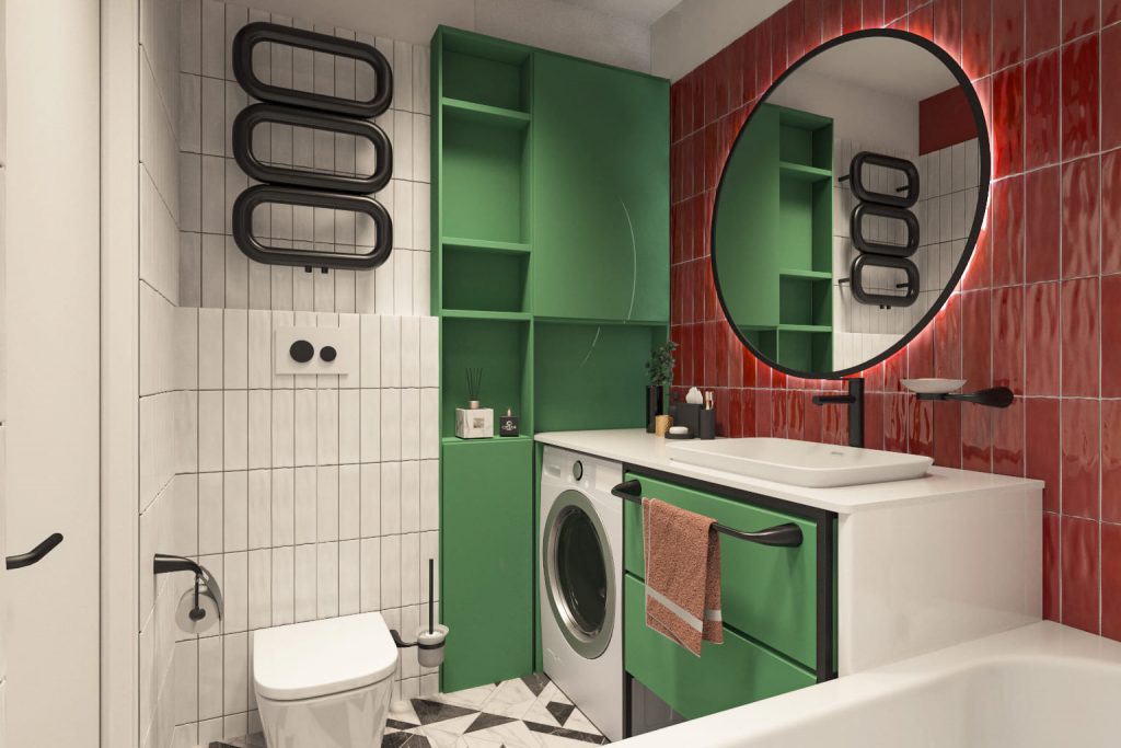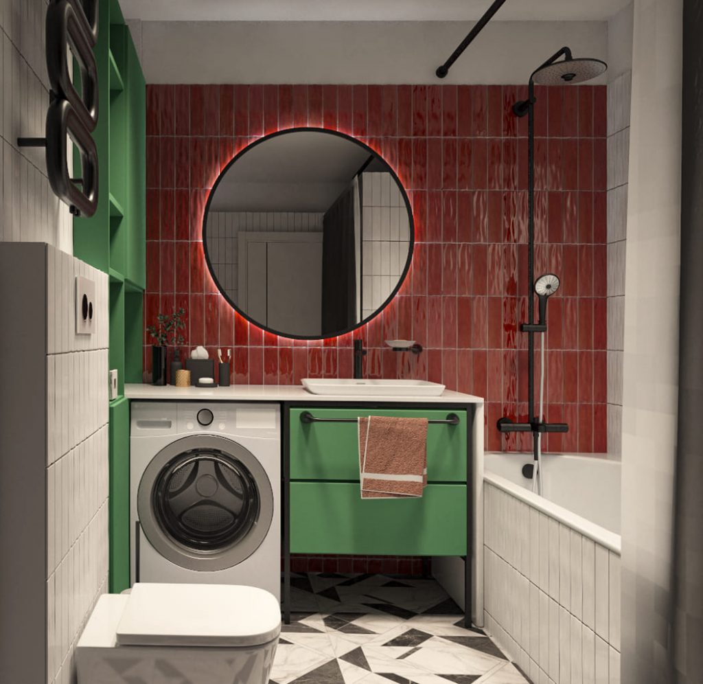Встроенная светодиодная подсветка за круглым зеркалом служит не только декоративной функцией, но и значительно улучшает освещение, что критично для зон умывания. Ванна с интегрированным душем и стеклянной перегородкой обеспечивает максимальную функциональность и гибкость использования, поддерживая чистоту и аккуратность благодаря эффективной системе водоотвода.