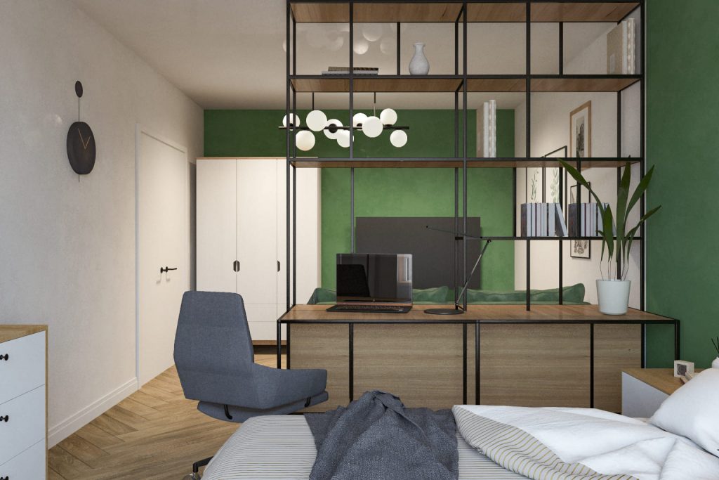 Рабочее место, организованное напротив окна, максимизирует использование естественного освещения, что способствует повышению продуктивности. Подвесные светильники и настенные бра в зоне спальни обеспечивают точечное освещение, акцентируя внимание на элементах декора и поддерживая зонирование без нарушения гармонии пространства.