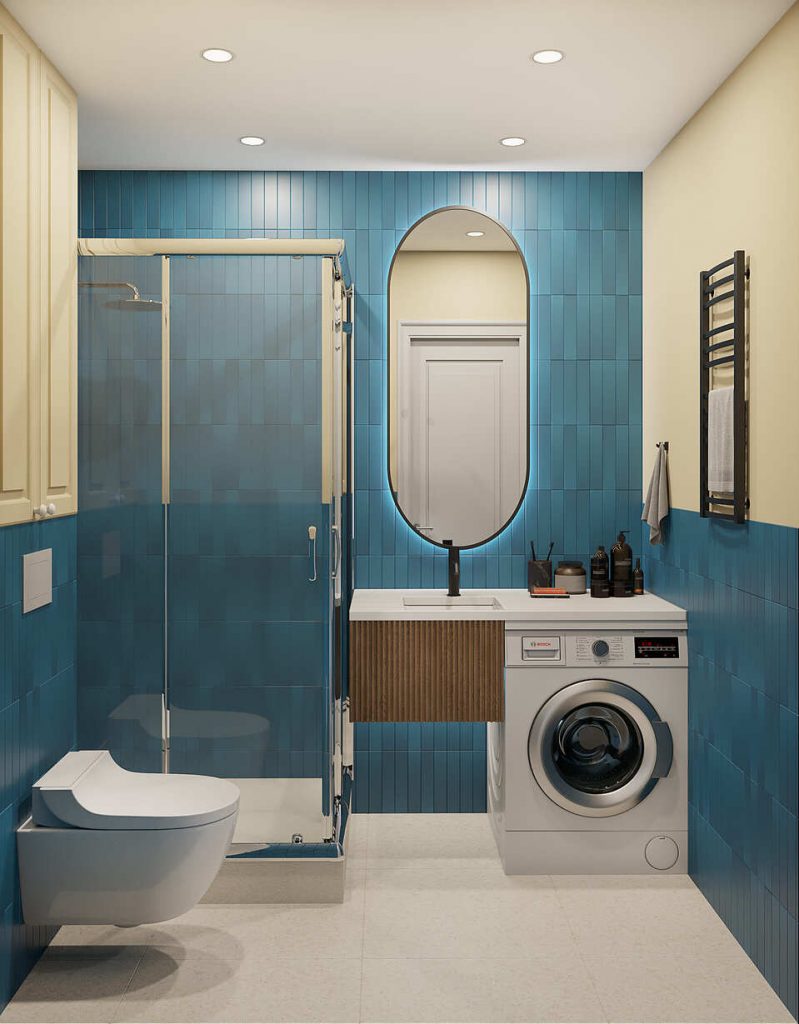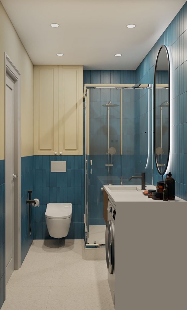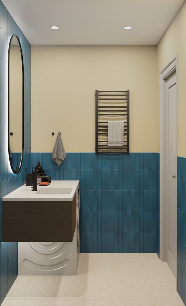 Основной акцент в санузле сделан на вертикальную плитку насыщенного голубого цвета, напоминающую морскую гладь. Она делает интерьер динамичным и визуально вытягивает пространство вверх. Верхняя часть стен окрашена в тёплый бежевый оттенок, который смягчает контраст и добавляет уюта.