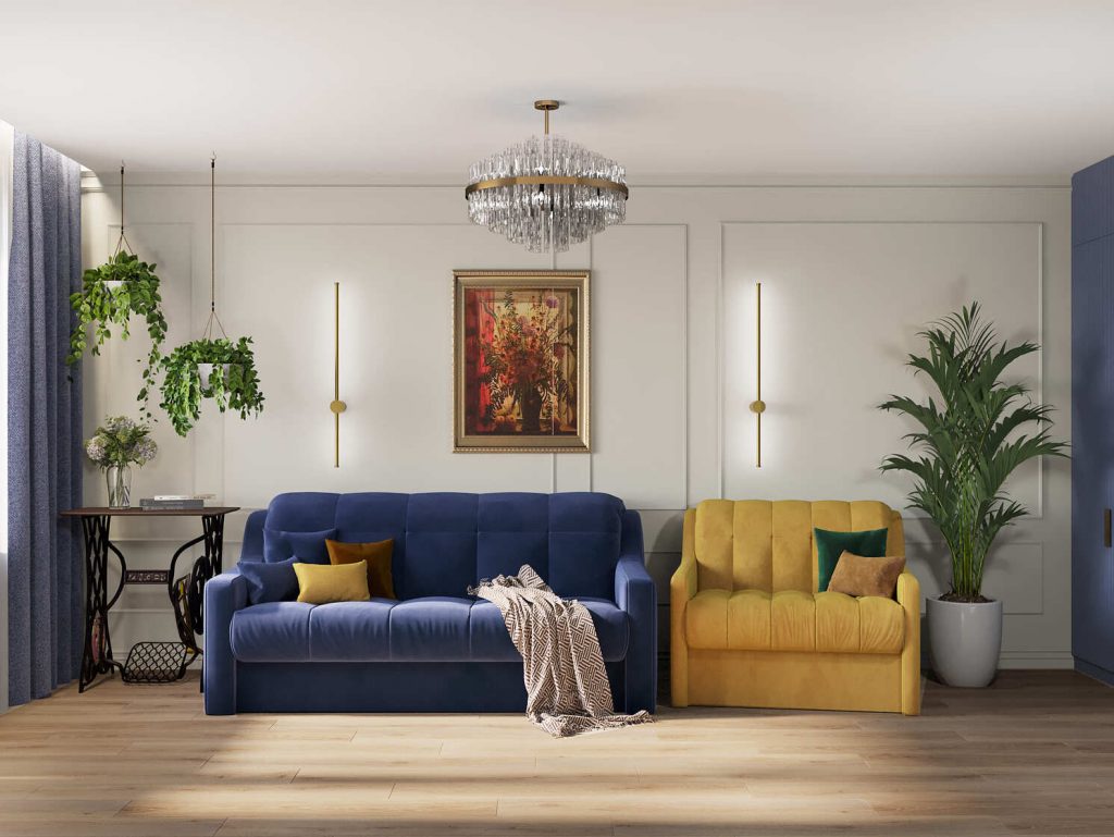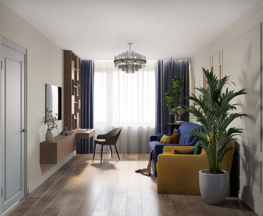 Основная палитра гостиной построена на нейтральных светлых тонах, которые визуально расширяют пространство и делают его более воздушным. Яркие мебельные акценты — глубокий синий диван и горчичное кресло — добавляют интерьеру характер и тепло. Сочетание этих насыщенных цветов создаёт гармоничный контраст, оживляя обстановку.