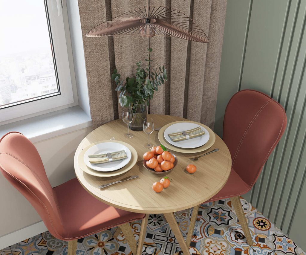 Обеденная зона — это уютный уголок, где приятно начинать день за чашкой кофе или устраивать уютные ужины. Компактный круглый стол на деревянных ножках дополняют мягкие стулья в глубоких терракотовых тонах, создавая контраст с основной палитрой. Лёгкая и изящная подвесная лампа с металлическими лепестками стала эффектным декоративным акцентом.