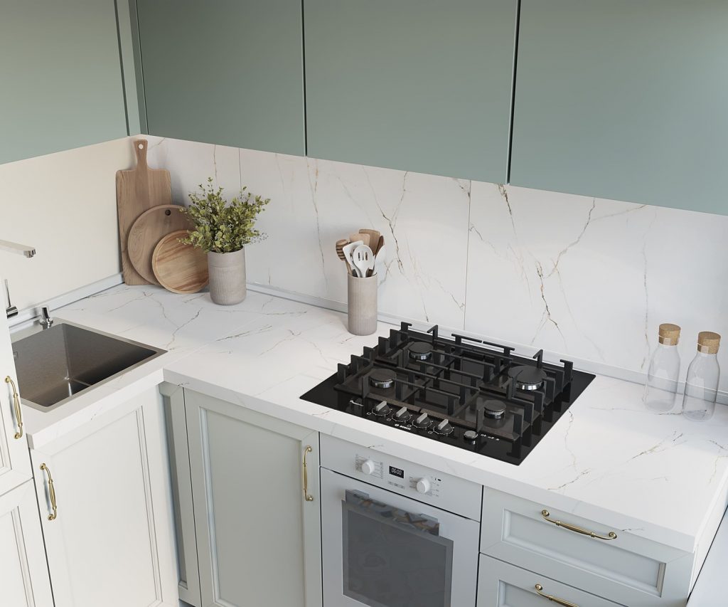 Рабочая зона оформлена максимально практично: столешница и фартук из светлого камня с тонкими золотыми прожилками добавляют интерьеру лёгкости и при этом удобны в уходе. Встроенная бытовая техника, эргономичное расположение раковины и варочной панели делают процесс готовки комфортным и эффективным.