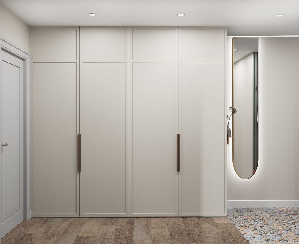 Функциональность — главный приоритет в небольшом пространстве. Вместительный шкаф с гладкими фасадами занимает одну из стен, обеспечивая достаточно места для хранения верхней одежды, обуви и других нужных вещей. Большое зеркало с подсветкой визуально расширяет пространство и добавляет легкости интерьеру.