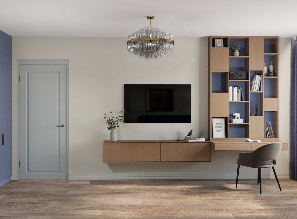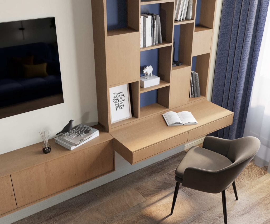 Комната объединяет несколько функций: здесь можно отдыхать, работать и принимать гостей. Вдоль стены расположена лаконичная подвесная тумба с рабочим местом — это решение позволило не загромождать пространство и оставить ощущение лёгкости. Открытые стеллажи дополняют композицию, обеспечивая место для хранения книг и декора.