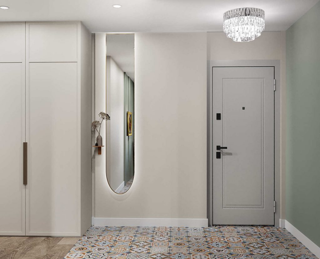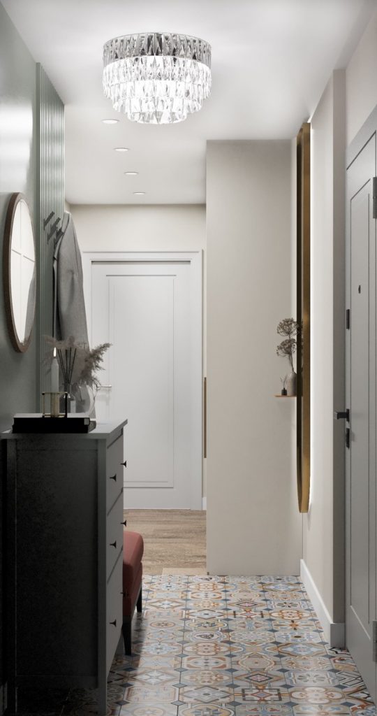 Пол отделан эффектной плиткой с узорами в средиземноморском стиле, которая не только украшает пространство, но и практична в уходе. Контрастный рисунок пола становится акцентом прихожей, добавляя динамики в спокойную палитру интерьера.