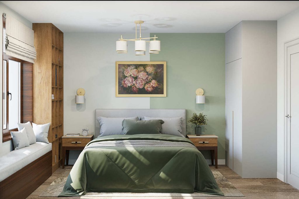 Основу интерьера спальни составляет мягкая природная палитра: белые и молочные оттенки в отделке гармонично сочетаются с приглушённым зелёным цветом стен и текстиля. Этот выбор неслучаен — зелёный символизирует баланс и умиротворение, помогая создать идеальную атмосферу для отдыха. Деревянные элементы — прикроватные тумбы, встроенный стеллаж, подоконник-сиденье — добавляют комнате естественного уюта.