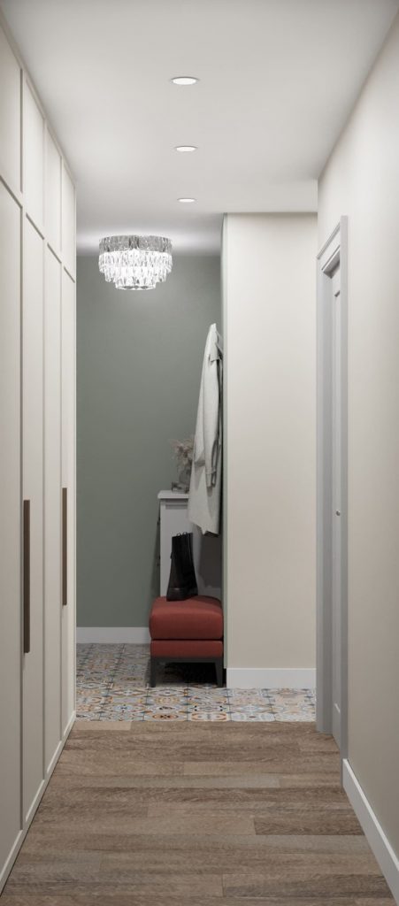Дизайн-проект двухкомнатной квартиры в брежневке для мужчины и женщины в светлых и теплых оттенках с яркими акцентами с прихожей, коридором, кухней, гостиной, спальней и санузлом