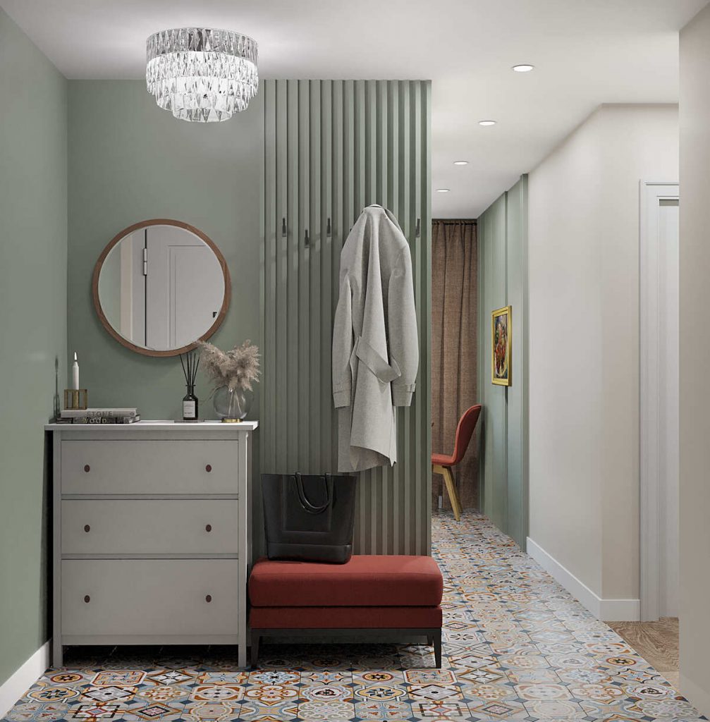 Прихожая оформлена в теплых, природных оттенках: мягкий оливковый цвет стен гармонирует с нейтральными белыми и бежевыми тонами, создавая уютную атмосферу с порога.