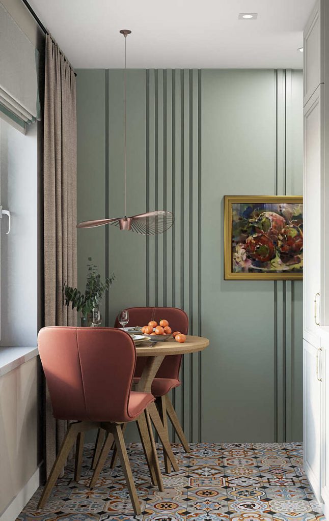 Кухня в этой квартире — это пример того, как можно создать стильное и удобное пространство даже в небольших габаритах. Основной акцент здесь сделан на светлую палитру с мягкими зелёными оттенками, которые добавляют свежести и природной гармонии. Фасады выполнены в сочетании молочного и приглушённого мятного цветов, а золотистая фурнитура придаёт интерьеру нотку элегантности.