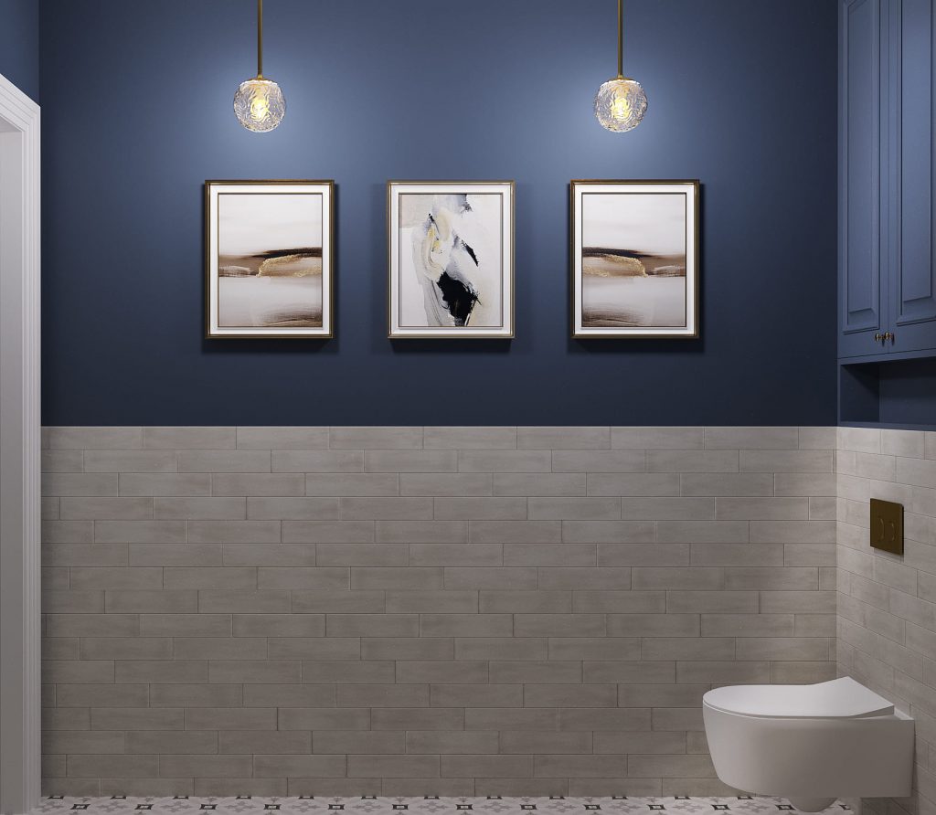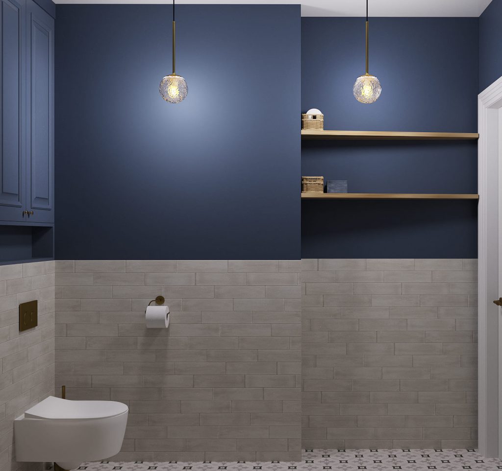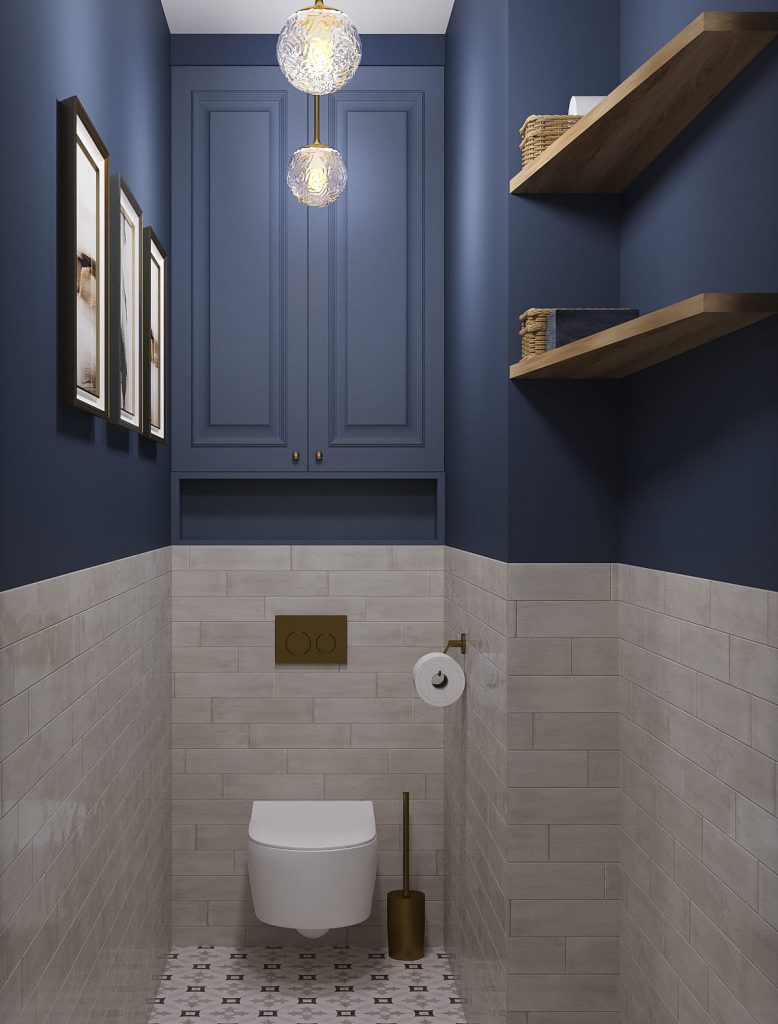 Санузел мы оформили с акцентом на современность и функциональность, сохраняя общую стилистику квартиры. Контраст глубокого синего цвета стен с серой плиткой создаёт стильный и свежий образ. Подвесной унитаз с инсталляцией облегчает уборку и визуально расширяет пространство — практично и эстетично.
