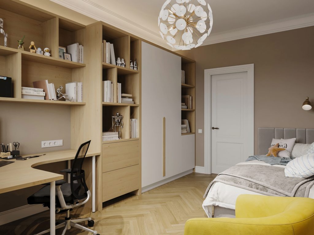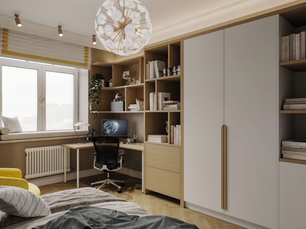 Для шестилетнего сына заказчиков, увлекающегося рисованием и конструированием, мы создали комнату, которая растёт вместе с ним. Учитывая его любознательность и энергию, мы организовали пространство так, чтобы оно было одновременно функциональным и вдохновляющим.