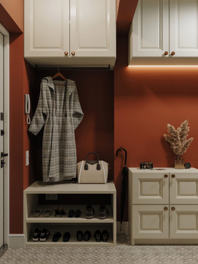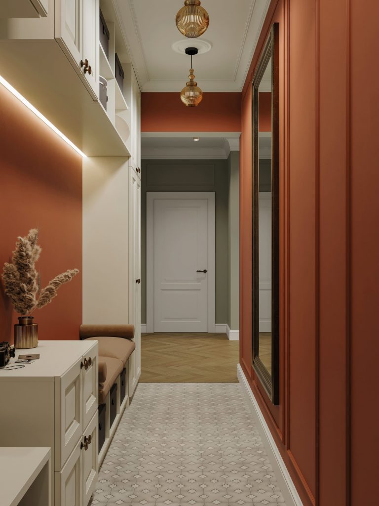 Яркая терракотовая стена в зоне прихожей стала акцентом, добавляющим тепла и динамики. Она приветствует гостей с яркостью, а также отражает энергичность наших клиентов.
