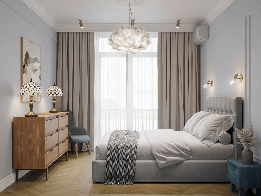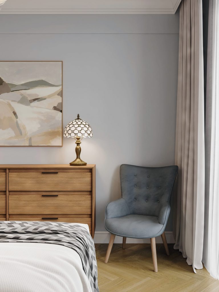 Стены украшены декоративными молдингами, придающими классический штрих, а направленные потолочные светильники позволяют настроить освещение под любое настроение — от яркого света для чтения до приглушённого для сна. Уютное кресло у окна в сочетании с деревянным комодом и лампой в стиле Тиффани создают уголок для вечерних размышлений или чтения.