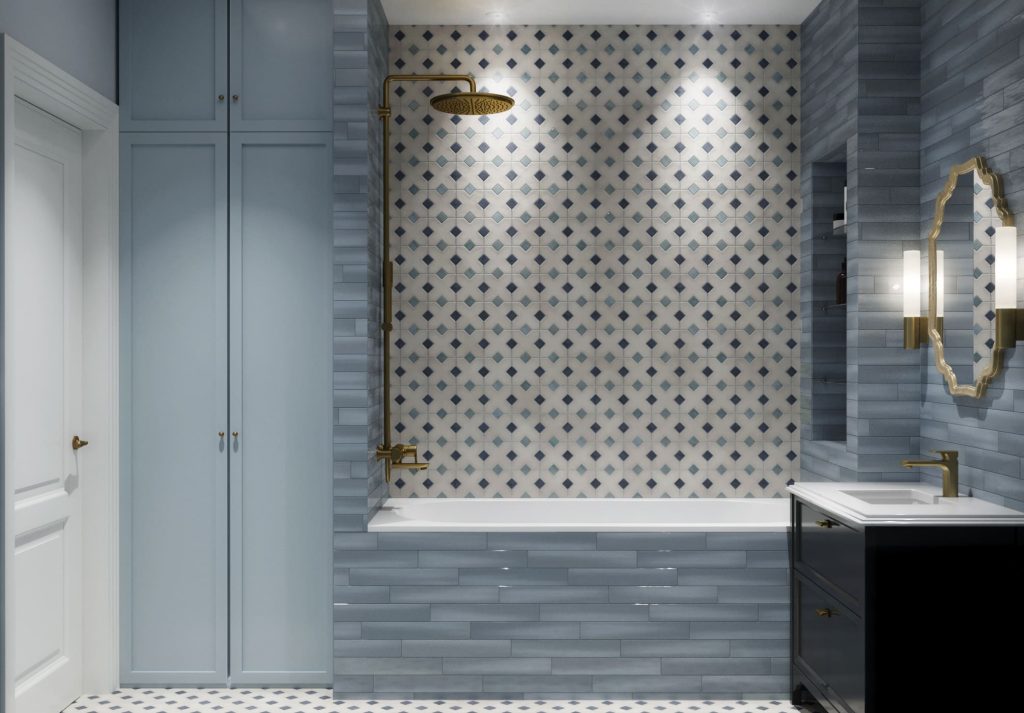 Ванную мы превратили в настоящий домашний спа, где можно расслабиться и забыть о суете мегаполиса. Глубокие синие тона рельефной плитки создают атмосферу спокойствия и релаксации. Наши клиенты ценят утончённость и комфорт, поэтому мы добавили золотистые акценты в виде зеркала с фигурной рамой и душевой системы с функцией тропического душа — немного роскоши никому не помешает!
