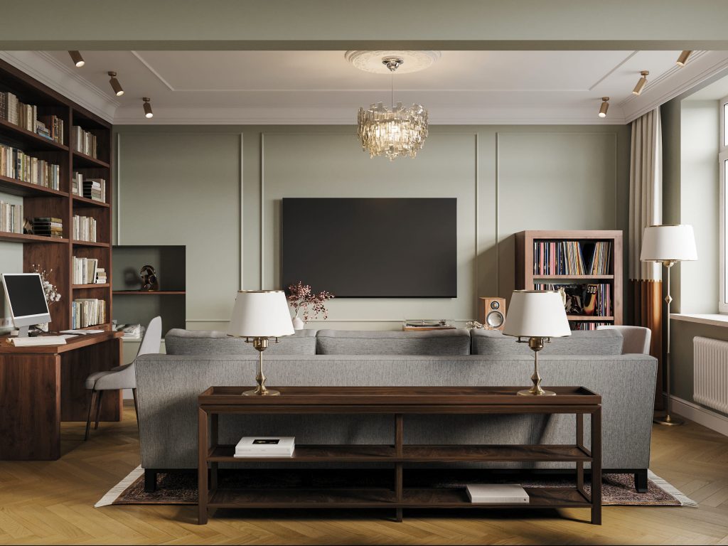 Декоративные молдинги на стенах и классические элементы интерьера добавляют изысканности, делая гостиную местом, где прошлое гармонично встречается с настоящим. А паркет «ёлочкой» подчёркивает индивидуальность и вкус хозяев дома.