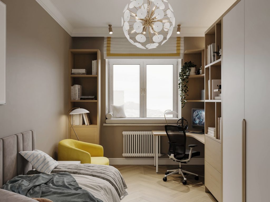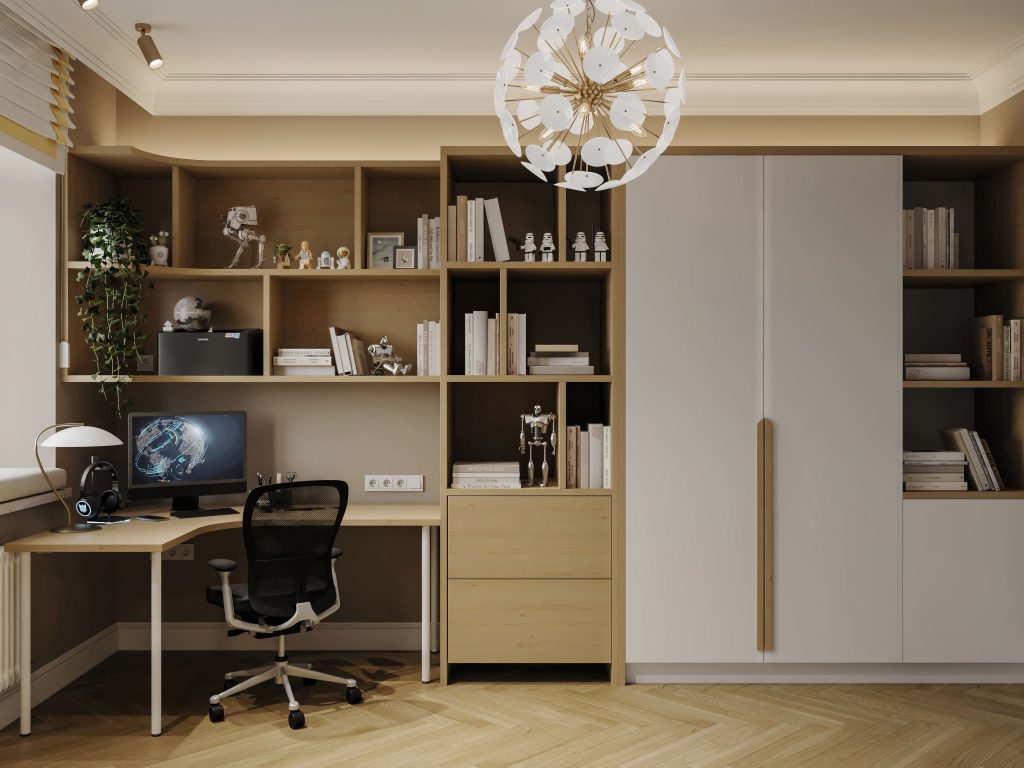 Подвесная люстра в форме шара и направленные потолочные светильники позволяют менять освещение в зависимости от активности — будь то игры, учёба или подготовка ко сну. Мягкие оттенки стен способствуют концентрации и спокойствию, создавая идеальные условия для развития маленького гения.