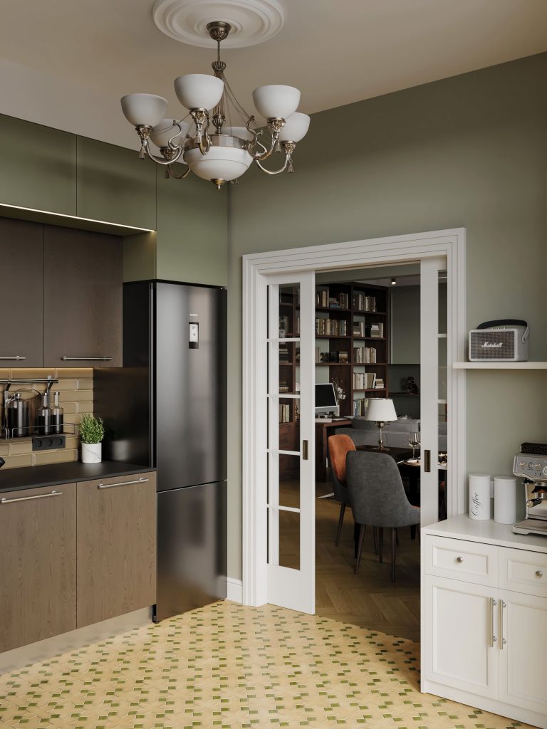 Особое внимание мы уделили фартуку с глянцевой поверхностью, сделанному под кирпич, который легко очищается и добавляет текстурный акцент. Но настоящей звездой кухни стала винтажная люстра — наследство от бабушки наших клиентов. Этот семейный артефакт освещает помещение и наполняет его особой атмосферой, связывая поколения. А выделенная кофейная зона у окна станет идеальным местом для утреннего эспрессо под звуки любимого джаза.
