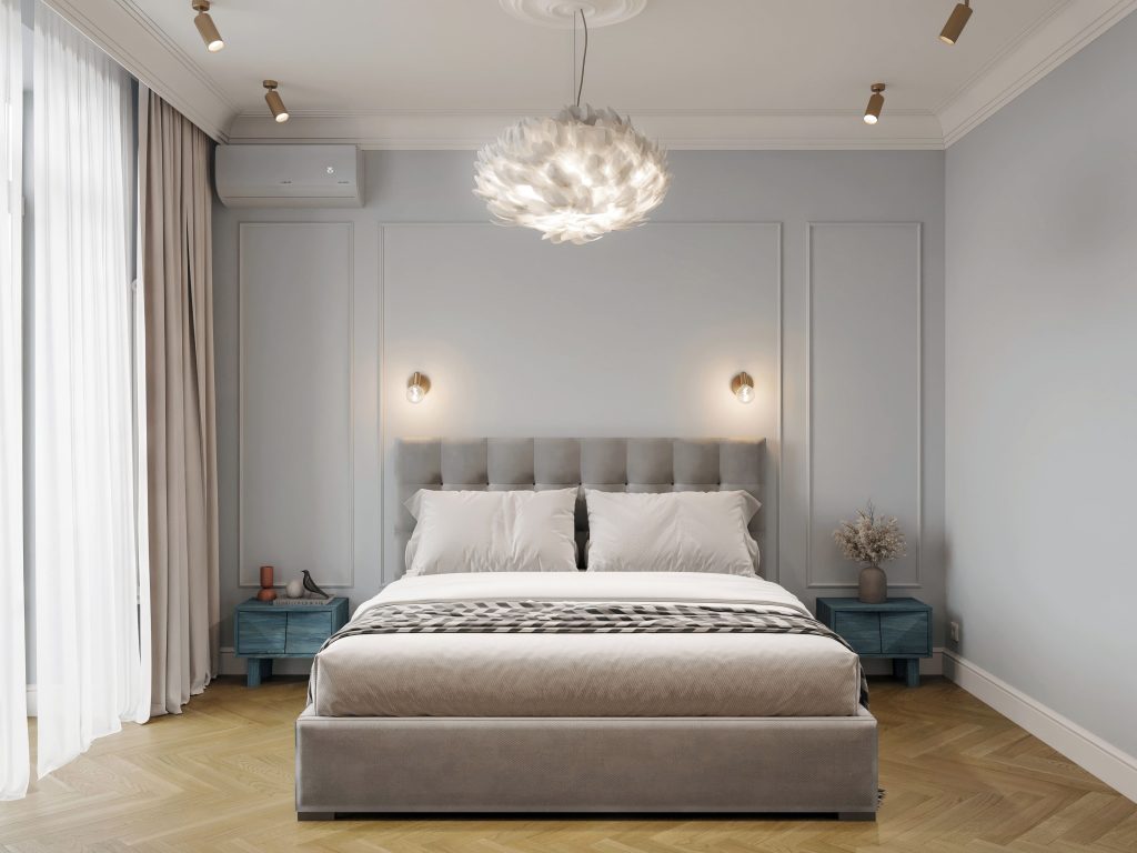 Центральное место занимает мягкая кровать с высоким изголовьем, обитым велюром глубокого синего оттенка. Симметрично расположенные прикроватные тумбы с изящными подвесными бра не только функциональны, но и подчёркивают гармонию пространства. Подвесная люстра-облако добавляет комнате особый шарм и наполняет мягким светом.