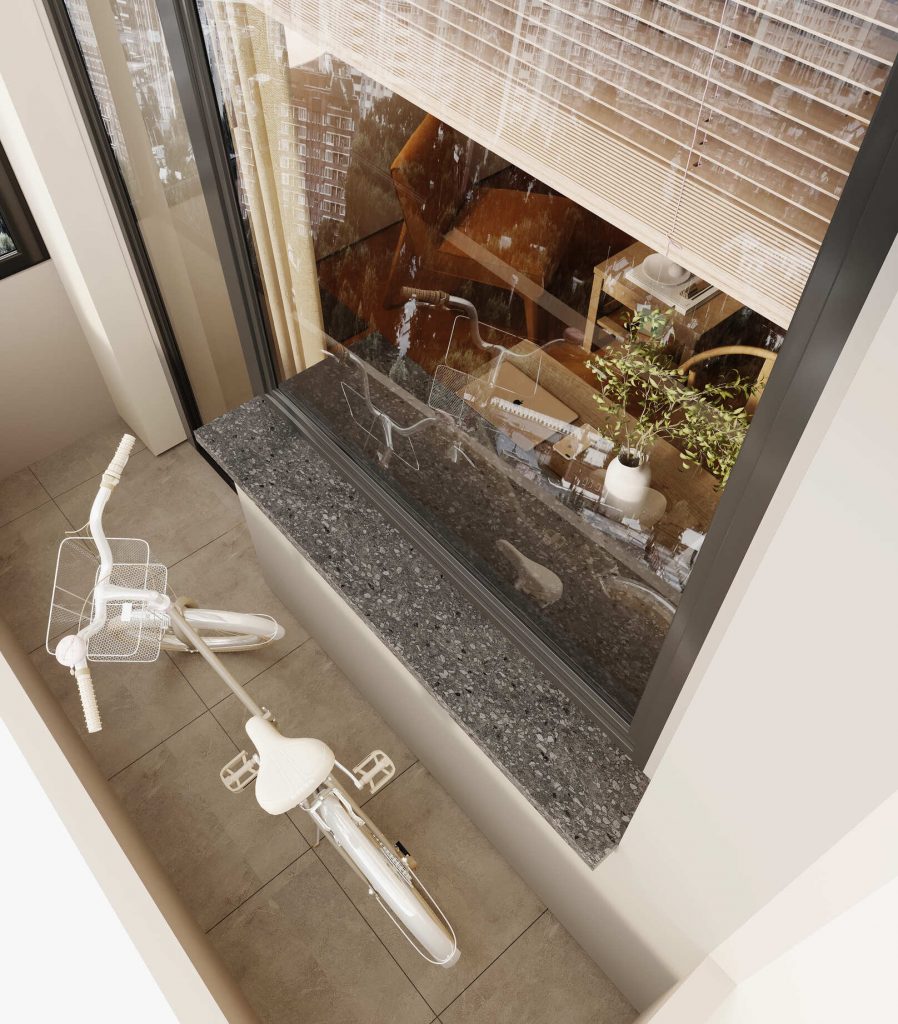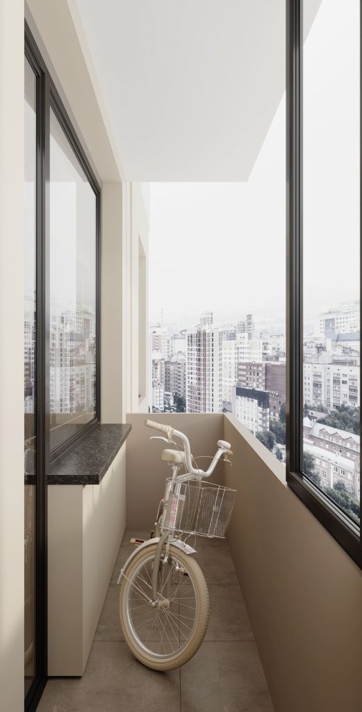 Контрастный белый балкон с чёрными акцентами оформлен в ретро стиле, соединяющим в себе и французский - здесь только весь молочного цвета велосипед с корзинкой на руле, который мысленно уносит нас на узкие, атмосферные улочки романтичной, утонченной Франции, и мы практически ощущаем аромат свежеиспеченного багета и потрясающего кофе на завтрак.