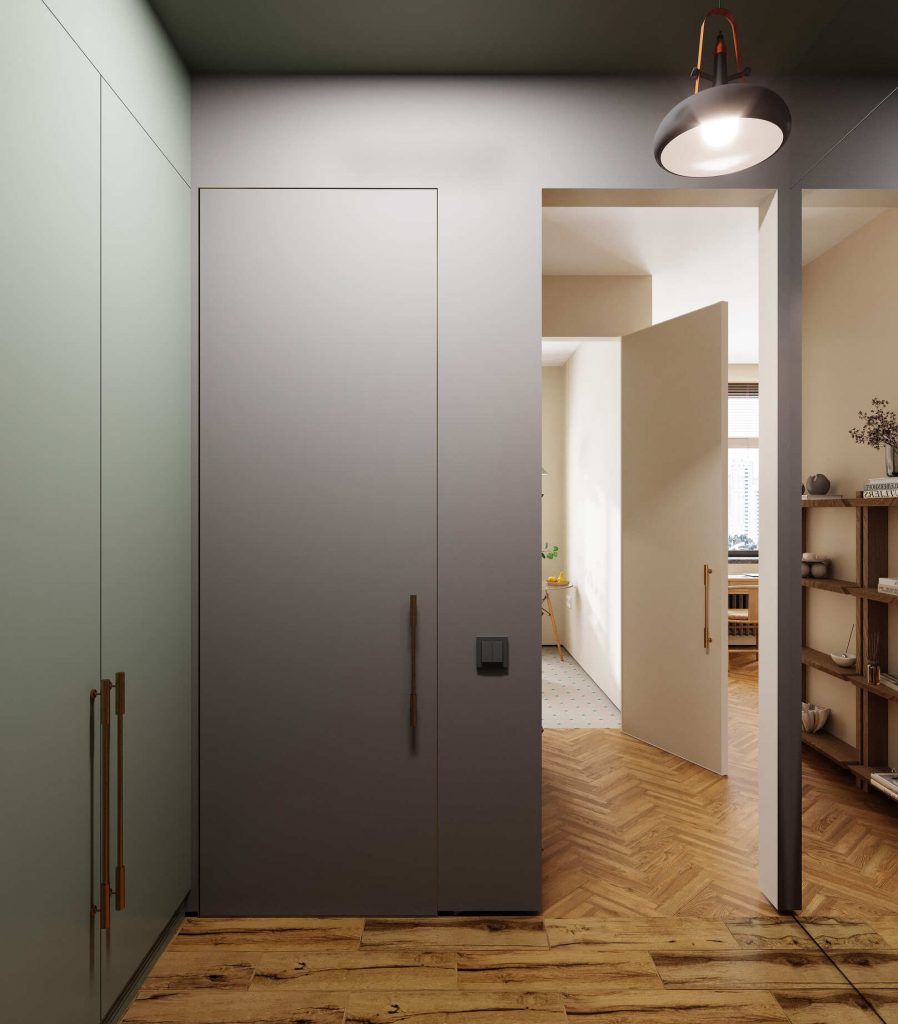 И прихожая полностью отвечает этим запросам. Здесь - только вешалка-планка с крючками; большой гардеробный встроенный шкаф до потолка, с отделением для встроенной же стиральной машины; зеркало целиком в одну из стен, что визуально ровно вдвое увеличивает пространство и даёт прекрасную возможность как следует осмотреть себя перед выходом из дома по делам. У прихожей, можно сказать, открытое пространство с гостиной-спальней, так как в перегородке между ними сделано два проёма без дверей - эдакий оригинальный стилистический ход, который вносит и долю функциональности - добавляет “воздуха” тому и другому помещениям.