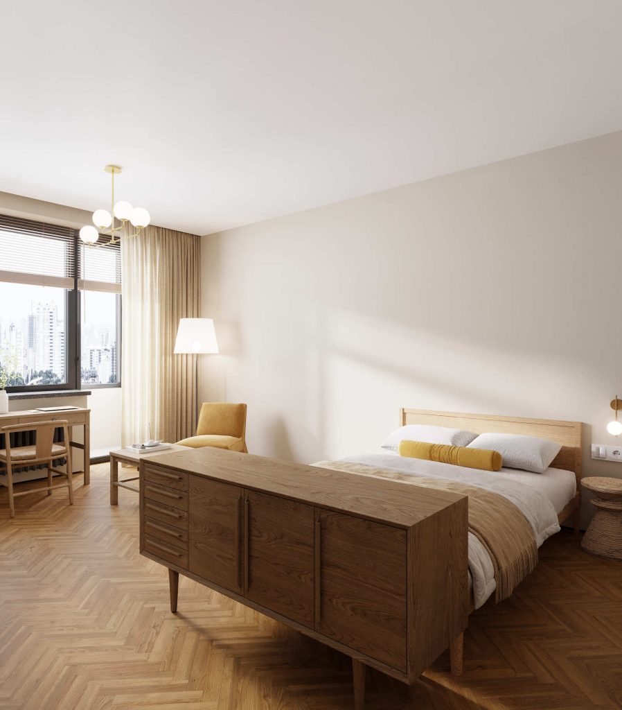 Первая включает более личную зону с кроватью и огромным встроенным шкафом во всю стену с вместительными зонами хранения, который разделен на три части. Рядом с кроватью - оригинальный туалетный столик.