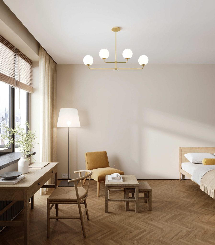 Большую светлую комнату еще большим светом и уютом наполняет бра-шар над туалетным столиком, из той же серии люстра и напольный светильник с абажуром около кресла, а паркетный пол “ёлочкой” добавляет историческую ноту, органично завершая общее оформление.