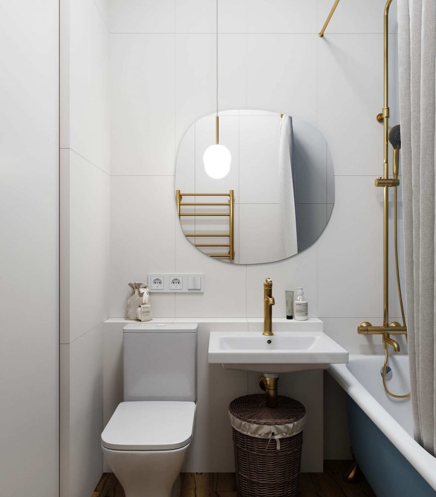 Очаровательная ванная в небесно бело-голубой гамме, создает воздушное, позитивное настроение. Функциональные элементы здесь - только основные и очень стильные - винтажная ванна на золоченых ножках, наружная часть которой окрашена в небесно-голубой цвет; прямоугольная раковина без тумбы, но с ретро корзиной для белья под ней; большое круглое зеркало над ней; напольный унитаз и сушитель для полотенец. Особый шик придают комнате: золотистая отделка приборов - сифона, смесителей, полотенцесущителя, гардины для шторы, и отделанная полностью глянцевой небесно-голубой мелкой плиткой стена за ванной.