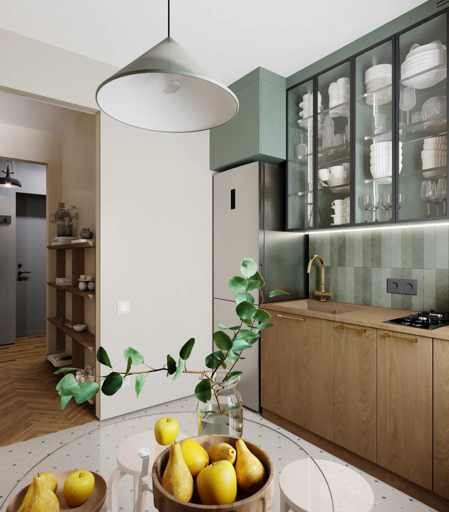 Основной акцент на кухне – зелёные оттенки. Фасады верхних шкафов, отделка ниши и подвесной светильник выполнены в мягком шалфейном цвете, который плавно перекликается с мебелью в прихожей. Такое решение объединяет зоны и делает интерьер цельным. В сочетании с тёплым оттенком дерева на нижних шкафах оно создаёт ощущение уюта и связи с природой.