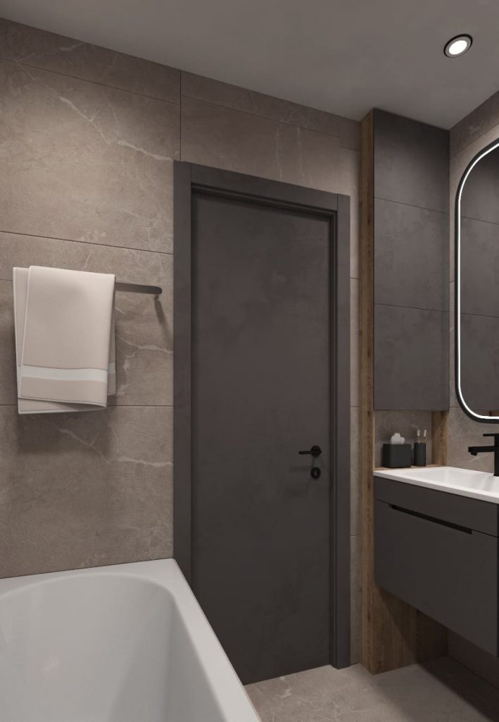 Ванная - тоже “мужественная”, функциональная и минималистично-лофтовая. Здесь все четко и по существу - ванна, мойка с подвесной раковиной и небольшим овальным зеркалом над ней, подвесной унитаз, встроенная стиральная машина под одной столешницей с мойкой. Система хранения - узкий-шкаф пенал с закрытыми секциями около входа над мойкой и полка-ниша с подсветкой над унитазом. Для удобства над ванной мы также разместили полотенцедержатель, а над стиральной машиной - полотенцесушитель. Оформлена ванная, в основном, в темных, мужских оттенках - антрацитовом (двери, мебель, инсталляция) и кофейно-коричневом (отделка стен керамогранитом), а белая сантехника (ванна, мойка, унитаз) создают необходимый баланс, чтобы интерьер не казался чересчур мрачным.
