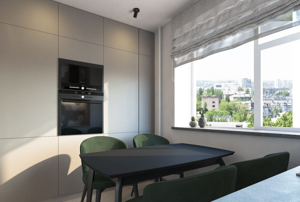 Оформлена кухня тоже строго по-мужски - антрацитовый оттенок корпусной мебели мебели и защитный зеленый - мягкой, отсутствие декоров. Благодаря принципу организации пространства open space вместе с прихожей, компактная кухня ощущается просторнее.