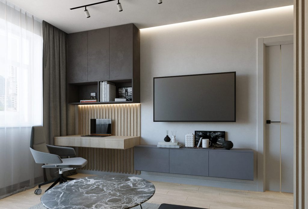 Также, по просьбе заказчика в гостиную-спальню добавлена зона мини-кабинета, состоящая из подвесного письменного стола, компьютерного удобного кресла и подвесного шкафа с открытыми отделением для книг и закрытыми секциями с дверцами. По оформлению - он тоже мужественен и лаконичен - антрацитового оттенка минималистичный шкаф, мужское строгое кресло, прямые линии.