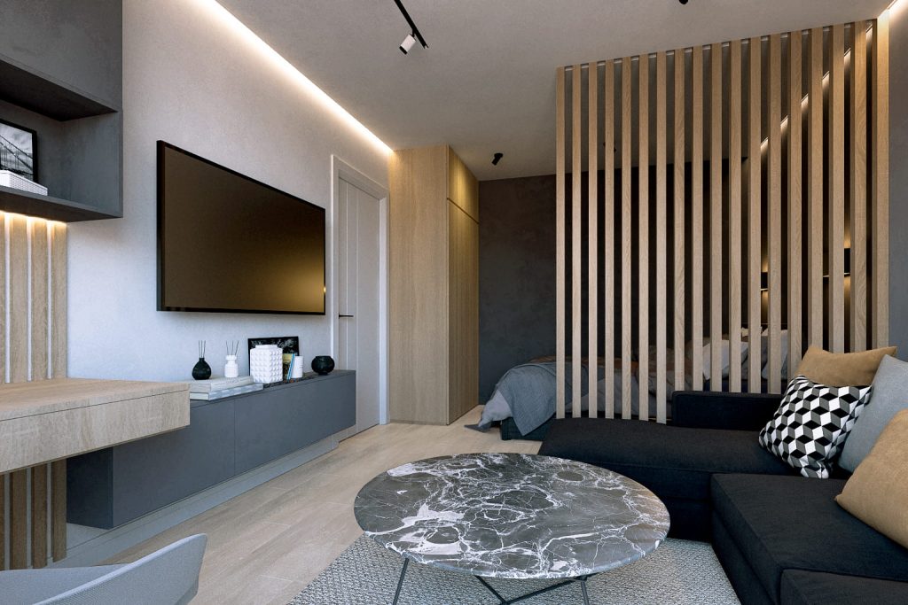 Дизайн-проект однокомнатной квартиры для для молодого мужчины в современном стиле в бело-серой гамме с антрацитовыми и темно-зелеными акцентами и деревянными элементами с прихожей, кухней, гостиной-спальней, ванной комнатой и лоджией