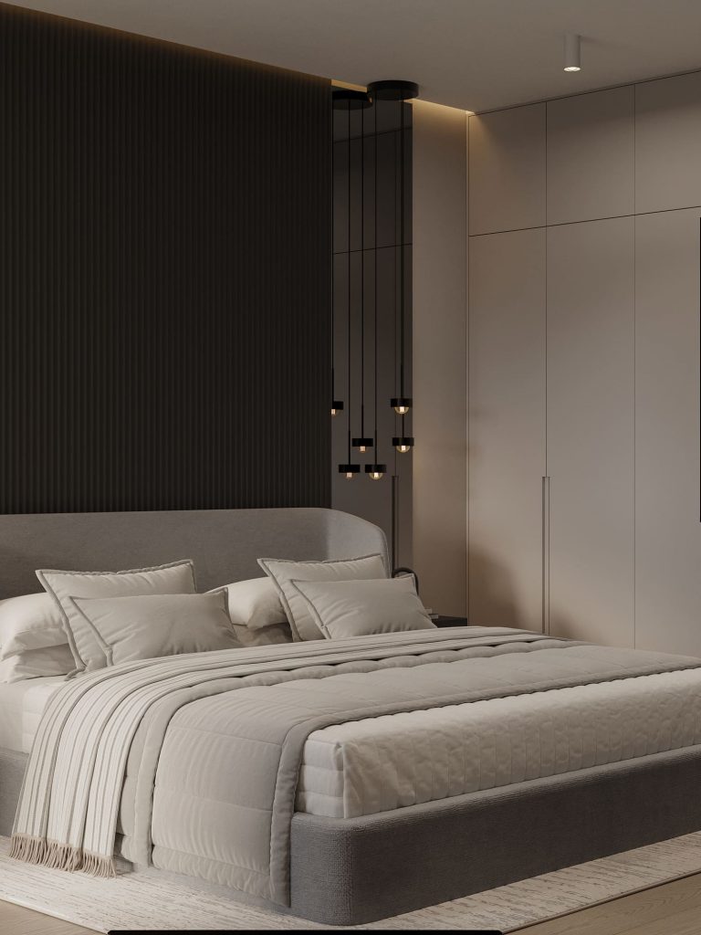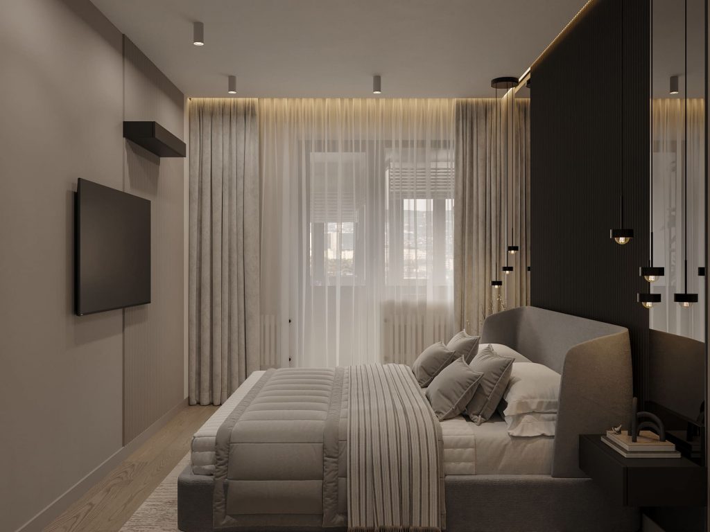 Просторная спальня - минималистичная и монохромная - по пожеланию заказчиков. В ней - только основное: большая удобная кровать, прикроватные подвесные тумбочки-консоли, ТВ панель напротив без тумбочки, чтобы не загромождать проход. Система хранения - большой гардеробный шкаф и полка под приставку над ТВ панелью. Ростовые зеркала за прикроватными тумбочками-консолями выполняют и функцию бьюти-зоны, и добавляют визуально глубины помещению. Грамотно подобранное освещение вносит больше уюта в спальню - вечером приватную обстановку создают: подвесные светильники над прикроватными тумбочками и потолочная подсветка. А основное освещение в темное время суток обеспечивают потолочные светильники, в светлое - окно и дверь лоджии.