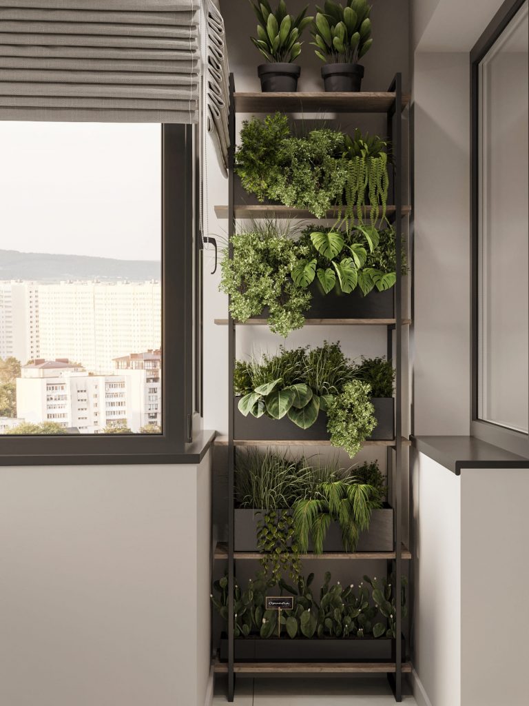 На второй застекленной лоджии добавлен стеллаж с открытыми полками для зимовки растений с дачи по просьбе заказчицы.