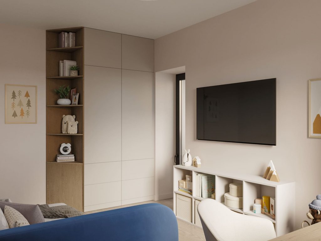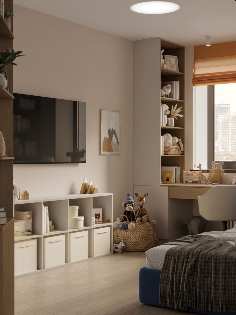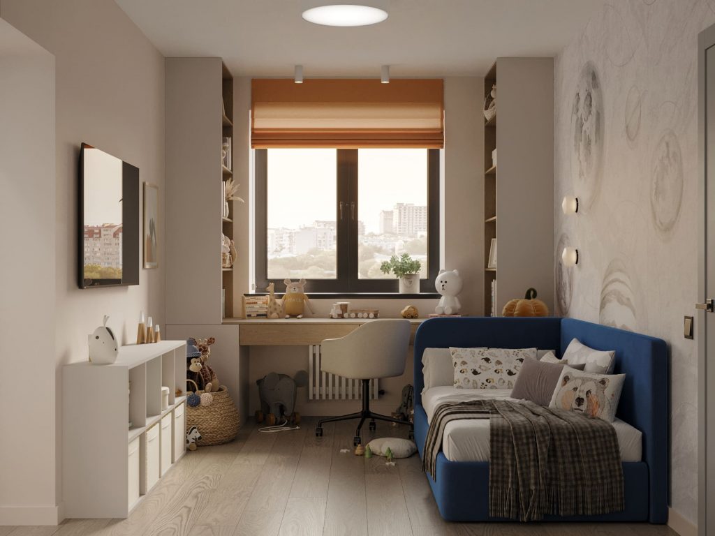 Зона отдыха - это удобный диван-кровать акцентного синего цвета, ТВ панель напротив, напольная ТВ тумба с открытыми и закрытыми секциями, в которой можно хранить декоры, игрушки и книги. Рабочее место представлено большим письменным столом с удобным компьютерным креслом. А система хранения предусмотрена под разные нужды - так, обрамляют с двух сторон письменный стол модули с открытыми полками для книжек и игрушек, во встроенном гардеробном шкафу можно разместить много детской одежды, а на его торцевых скошенных открытых полках также можно поставить декоры, игрушки, книги.