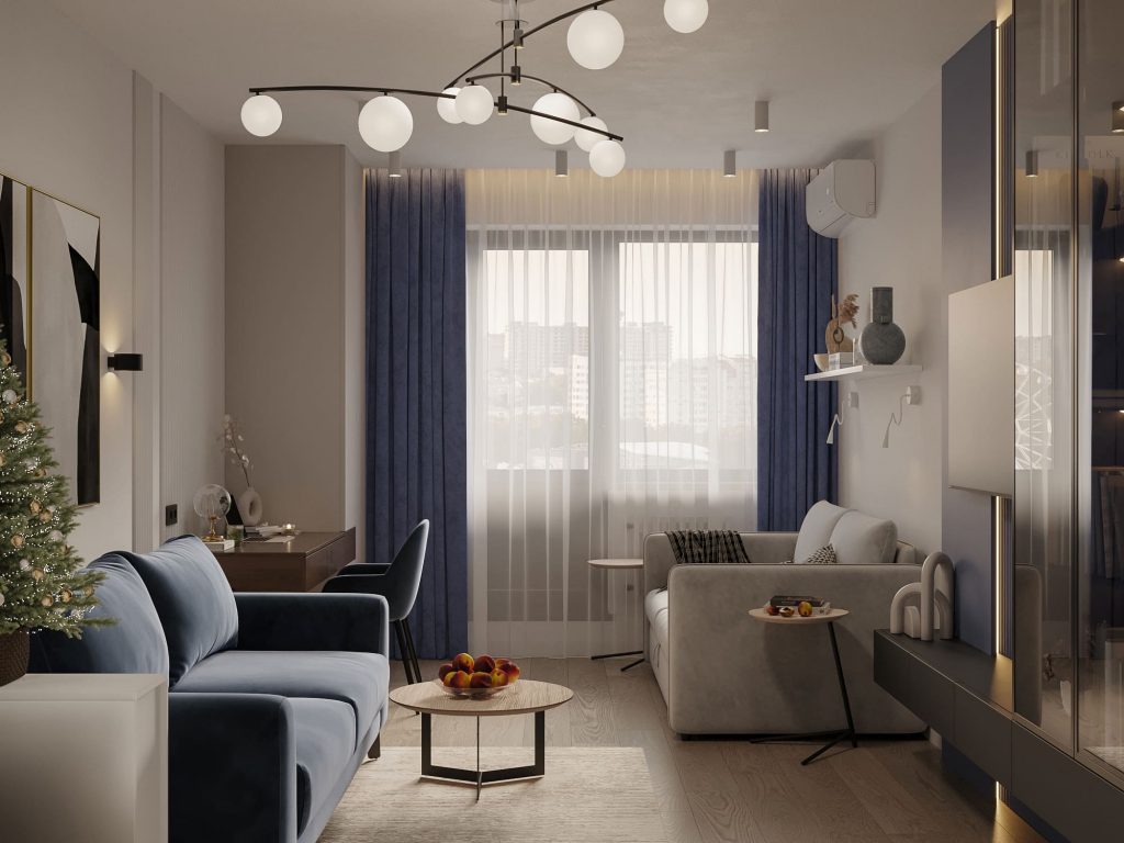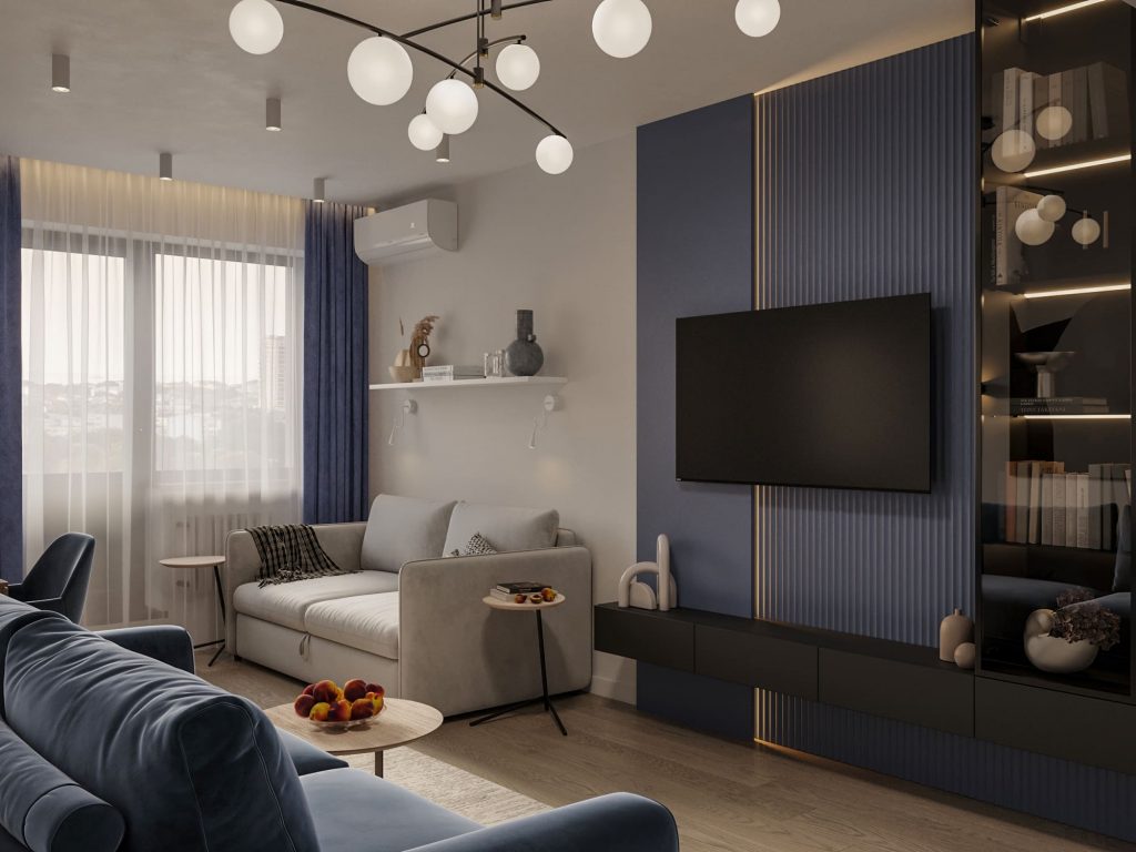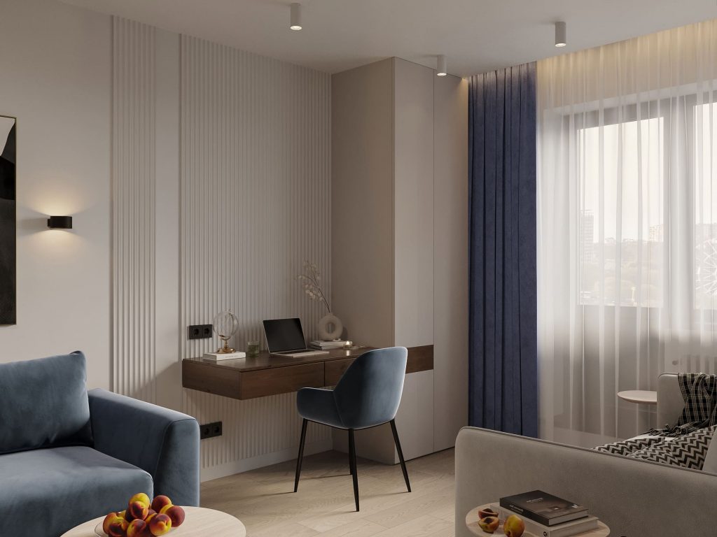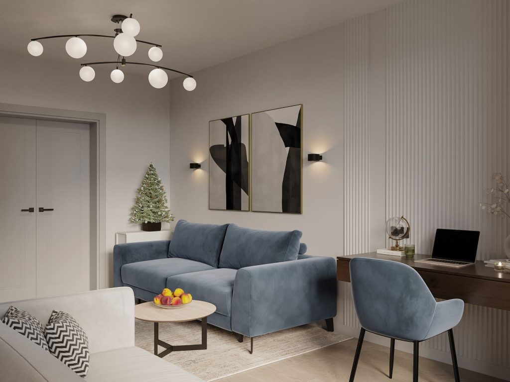 Этот дизайн-проект разрабатывался для семейной пары с двумя детьми с большой разницей в возрасте - 18 и 2 лет. Заказчики хотели получить светлый современный интерьер с добавлением синего и зеленого цветов. С учетом этого мы создали функциональное стильное пространство, в котором было бы уютно всем - маленькому ребенку, юному студенту и зрелым родителям.