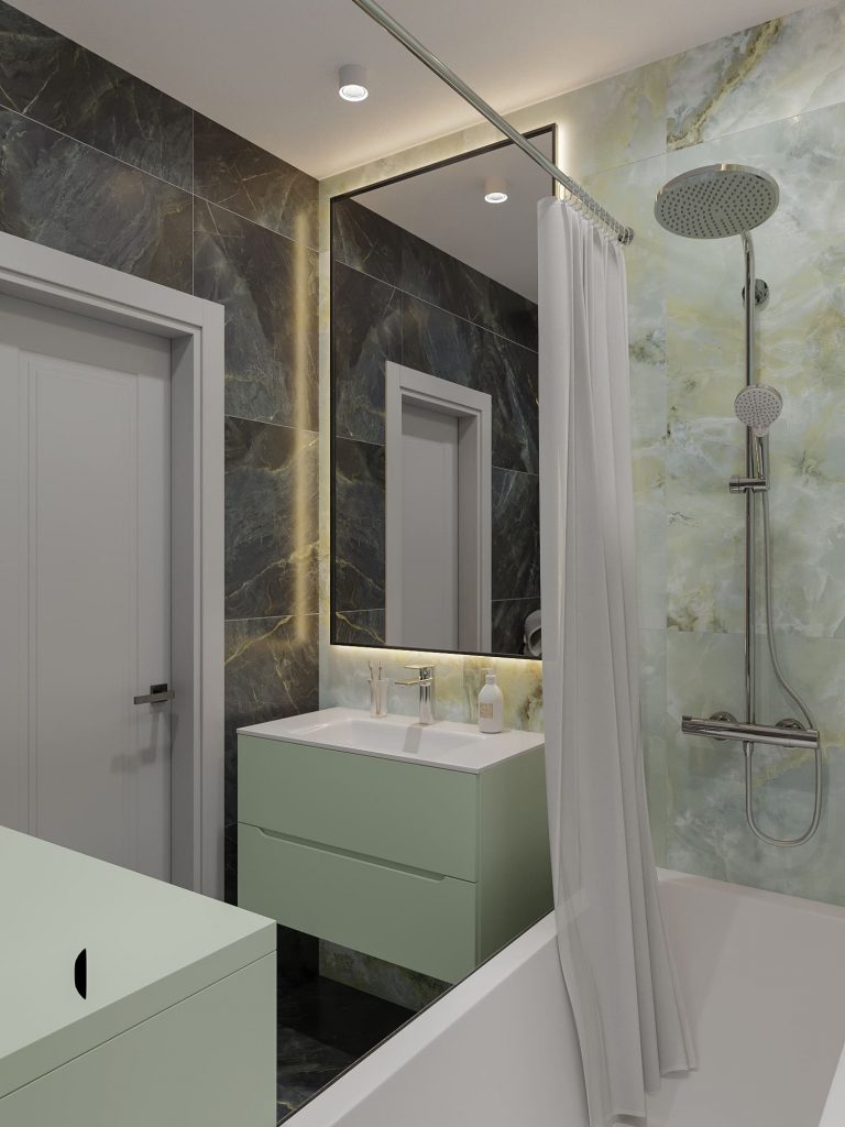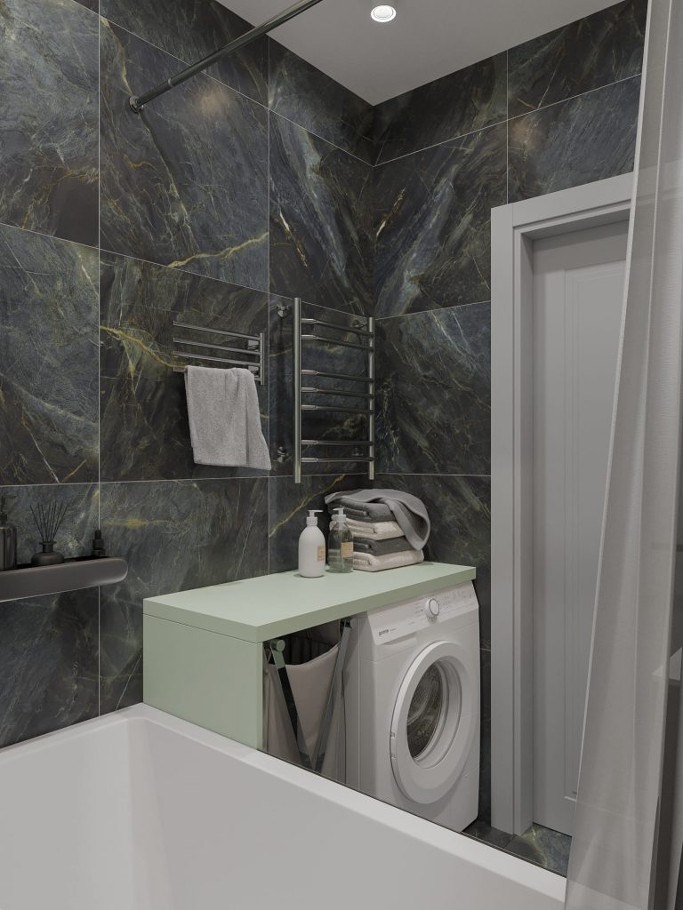 В компактной ванной размещено только функционально необходимое - сама ванна, раковина с подвесной тумбой, над ней - зеркало до потолка, встроенная стиральная машина. Также, здесь предусмотрены полотенцесушитель, полотенцедержатель и полочка для шампуней, пены для ванны, жидкого мыла. Оформлена комната в приятных салатовых и изумрудных оттенках. Основное освещение комнаты обеспечивается точечными светильниками, дополнительное - подсветкой зеркала.