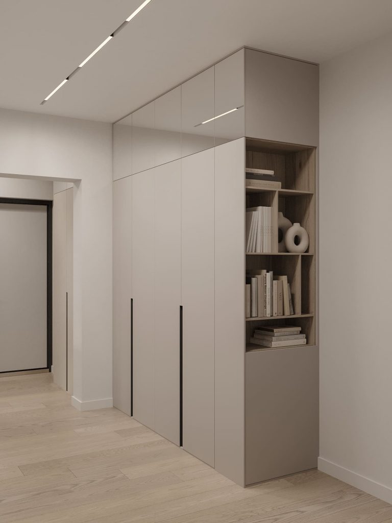 В коридоре размещен лишь большой гардеробный шкаф в потолок (с торцевыми открытыми полками для книг и декоров и зеркальными дверцами на антресольном отделении), что дает возможность не перегружать мебелью другие комнаты.