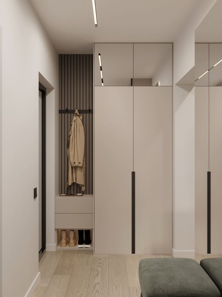 Прихожая встречает спокойствием и лаконичностью. Тут практически вся мебель - встроенная: компактная обувница с нижним открытым отделением и двумя выдвижными ящиками, на которую сверху можно положить ключи; над ней - панель из деревянных реек, к которой прикреплена вешалка-планка с крючками для одежды; вплотную к ней - гардеробный шкаф от пола до потолка с зеркальными дверцами антресольного отделения; удобный небольшой пуф с акцентной изумрудного цвета обивкой; за ней - ростовое зеркало.