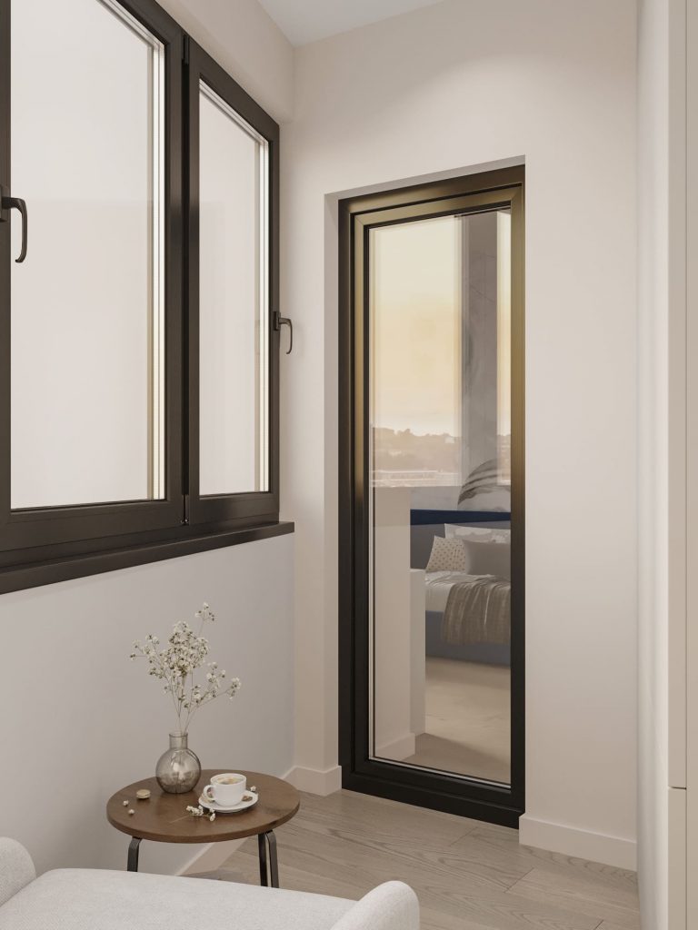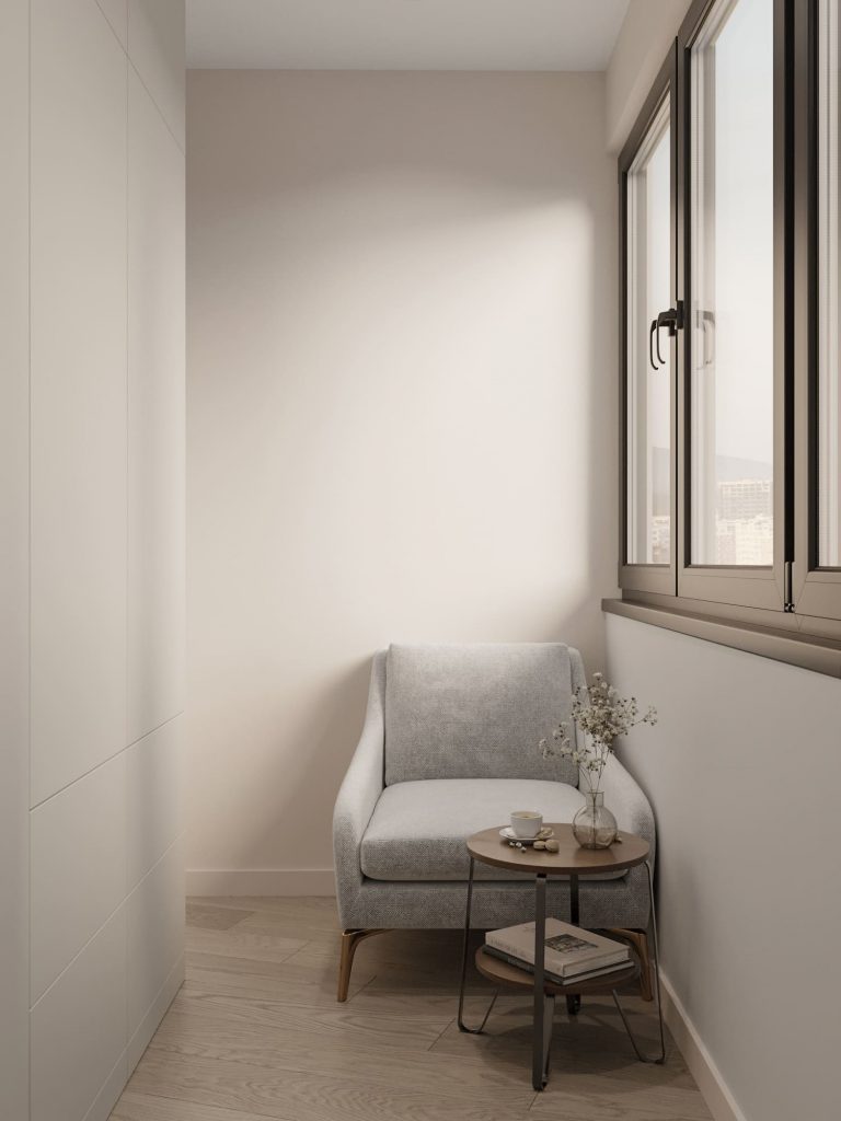 На первой застекленной лоджии размещено место отдыха в виде большого удобного кресла и красивого кофейного столика - здесь так приятно утром или вечером выпить кружку любимого напитка, восхищаясь сказочным рассветом или потрясающим закатом.