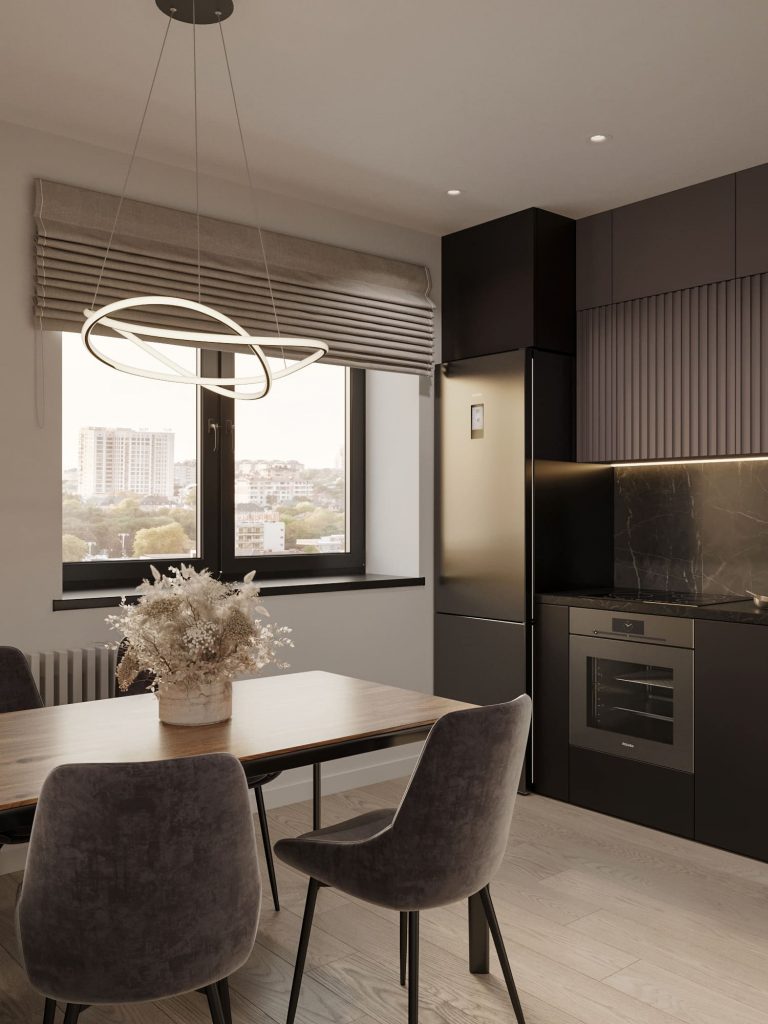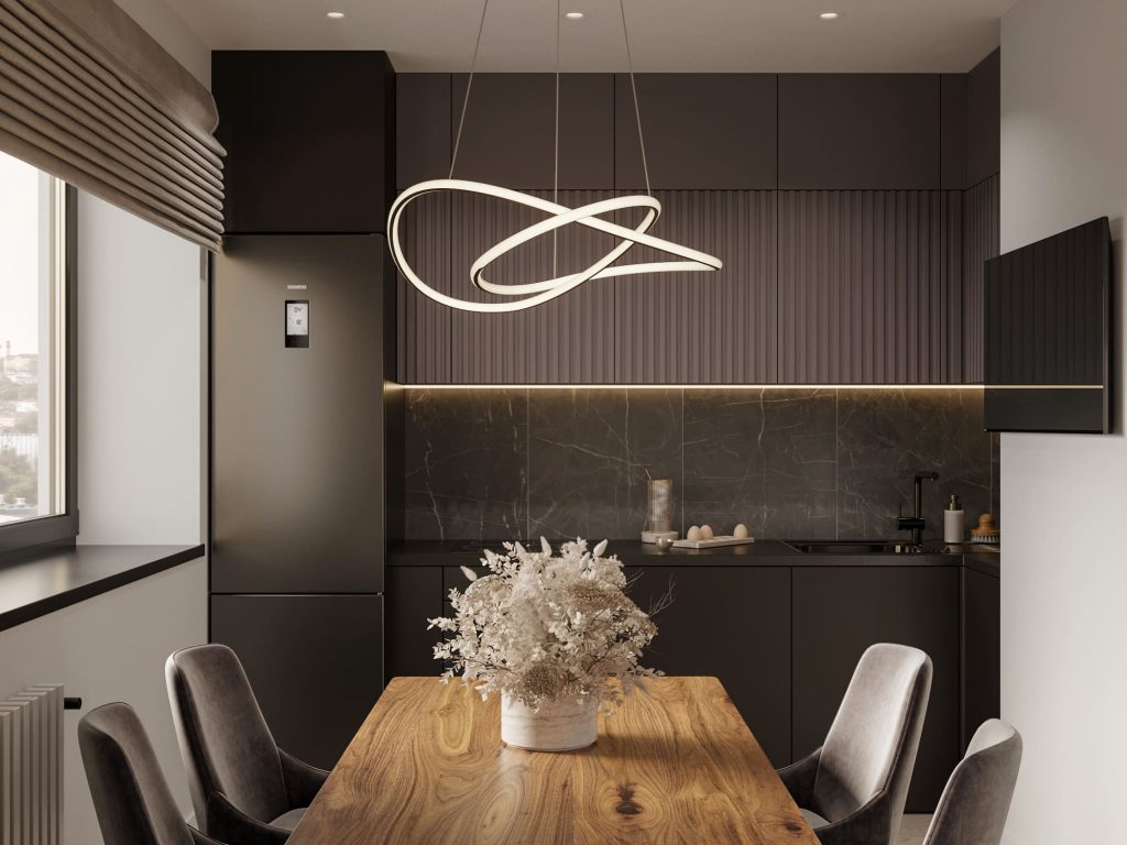 Несмотря на то, что кухня оформлена в монохромной гамме, она - вполне уютная и теплая за счет правильно подобранного освещения. Так, много света поступает из большого окна днем, вечером подсветка верхних шкафов освещает рабочую поверхность кухни-ниши, большая “летящая” люстра - столовую зону, подсветка в верхних шкафах со стеклянными дверцами - посуду. А основное освещение кухни обеспечивают потолочные точечные светильники.