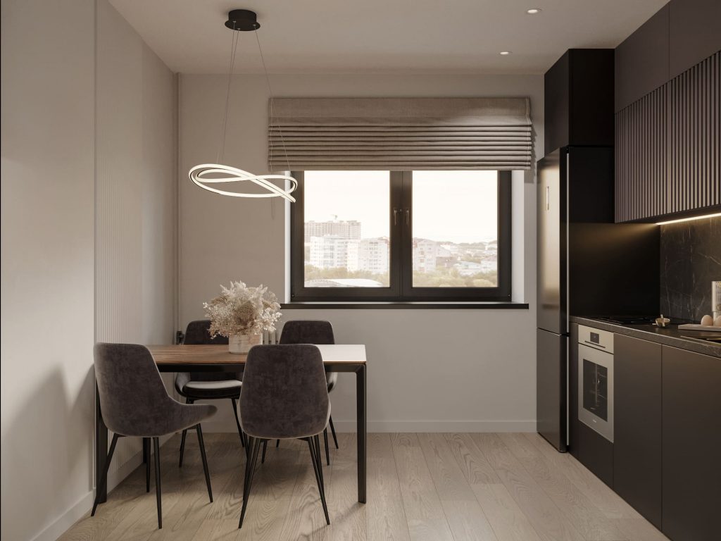 В ней нет ни одного лишнего предмета - все только самое нужное. Она включает зоны кухни и столовой.